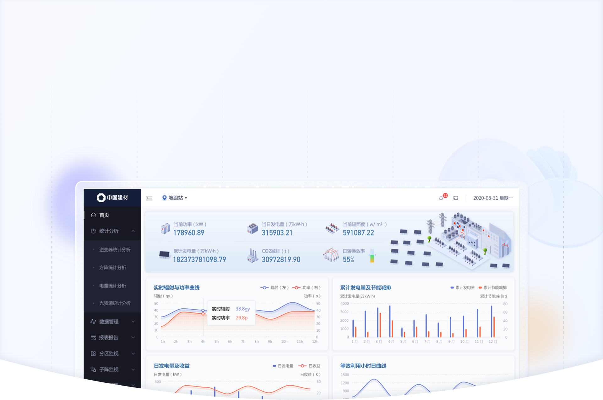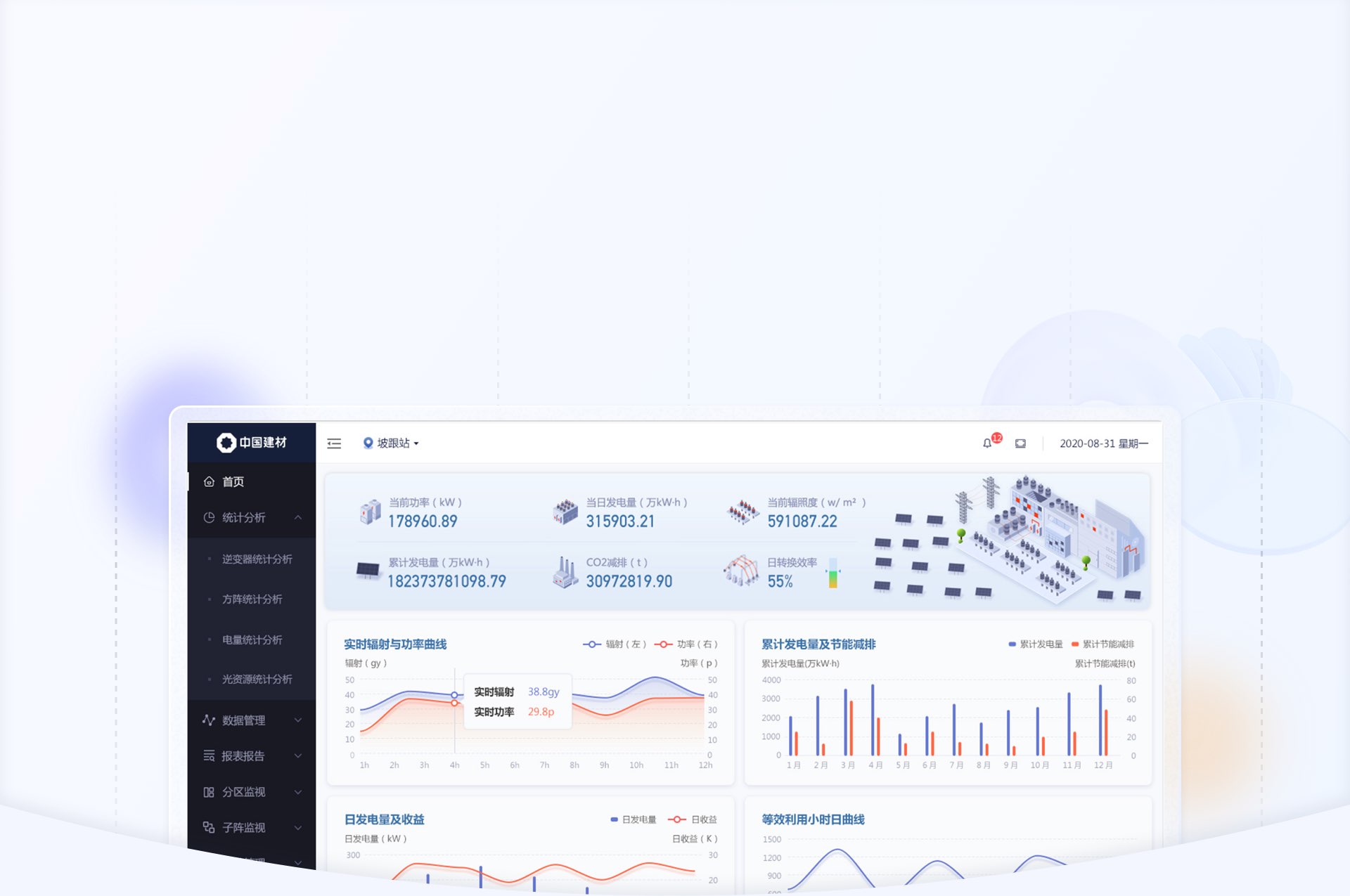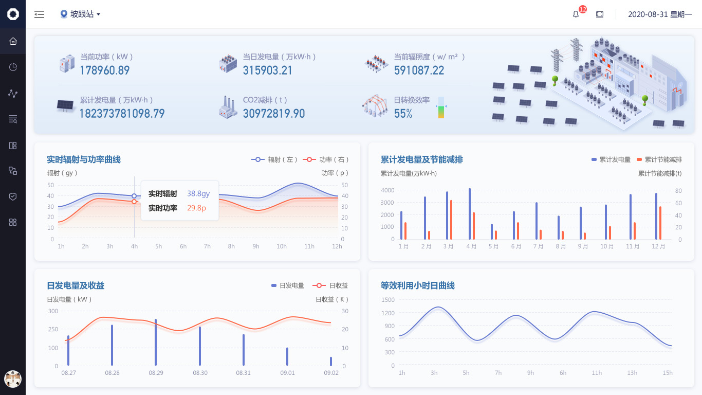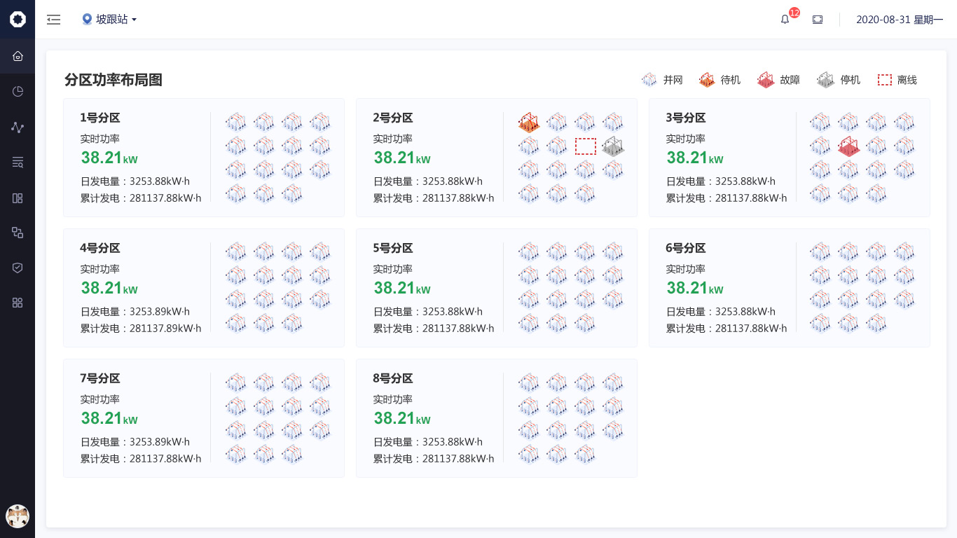 針對(duì)數(shù)據(jù)信息發(fā)生的變化,我們使用“場(chǎng)景化設(shè)計(jì)原則“,用立體圖標(biāo)方式繪制出從”光伏板-逆變器-交流匯流箱“發(fā)電原理圖,把數(shù)據(jù)展示在對(duì)應(yīng)的環(huán)節(jié)中,形成可視化的實(shí)時(shí)監(jiān)控圖譜。;其余與發(fā)電流程無關(guān)的數(shù)據(jù)也均以圖標(biāo)+文字的形式展示頁頁面右側(cè)。