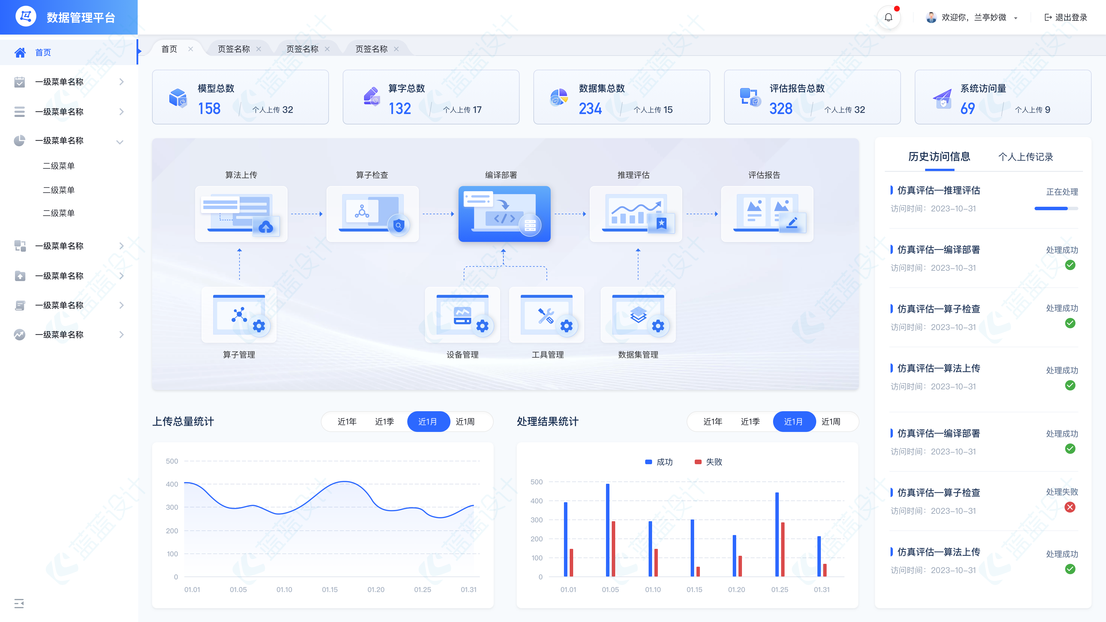 該系統(tǒng)的原首頁(yè)中信息量比較少,在設(shè)計(jì)時(shí)除了對(duì)頁(yè)面美觀的優(yōu)化,從內(nèi)容、布局、用戶(hù)使用場(chǎng)景、使用習(xí)慣、交互方式等方 面也進(jìn)行考慮,增加了一些統(tǒng)計(jì)的圖表, 「歷史訪問(wèn)信息」采用卡片式列表,突出模塊和內(nèi)容。同時(shí)增加「?jìng)€(gè)人上傳記錄」信息和「歷史訪問(wèn)信息」可以進(jìn)行 切換查看。