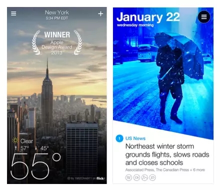 例如以設計精美著稱的Yahoo的兩款明星App產品Yahoo Weather!和Yahoo Digest。除了在產品設計上的和突出表現(xiàn)外,模糊和斜切的手法,給整個產品的品牌氣質提升到了一個新的高度。 Yahoo Weather! 不論是在布局、字體和色彩的運用上都顯得精致細膩,滑動時高斯模糊的處理更是流暢平滑。Yahoo Digest 的斜切突出一個“破”,在不影響照片內容的前提下,既能在視覺上顯得與眾不同,又在排版上巧妙地為色彩標簽留了一角之地。比起一刀平,更顯靈動而不失平衡感。