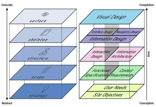 想了解 UI/UX,就一定要了解這張圖,這是 Jesse James Garrett 在2000年發(fā)表的用戶經(jīng)驗元素一書中所提出:使用者的經(jīng)驗可分成抽象到具體,也就是由策略、范圍、結(jié)構、骨架、表層所構成。