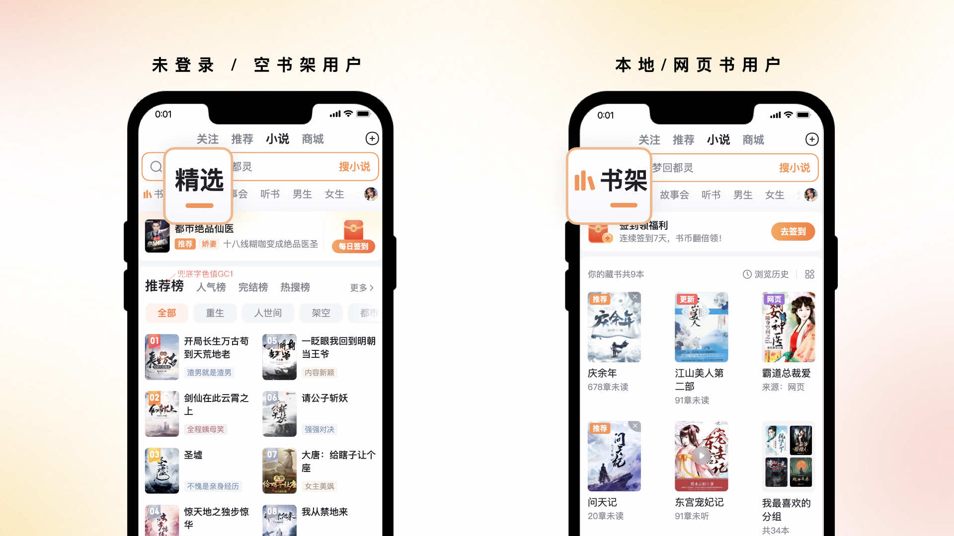 以人為本的設(shè)計能夠更貼心地滿足用戶的需求和期望,通過關(guān)注用戶的喜好、行為和習(xí)慣,讓用戶體會到關(guān)懷和舒適的享受。因此,針對于不同的用戶行為進行了精細化的設(shè)計。對于未登錄、書架為空的用戶,我們默認為用戶錨定到精選的tab,而針對本地書、網(wǎng)頁書的用戶,我們?yōu)槠涠ㄎ坏綍艿膖ab,方便用戶更精準(zhǔn)的切入場景。