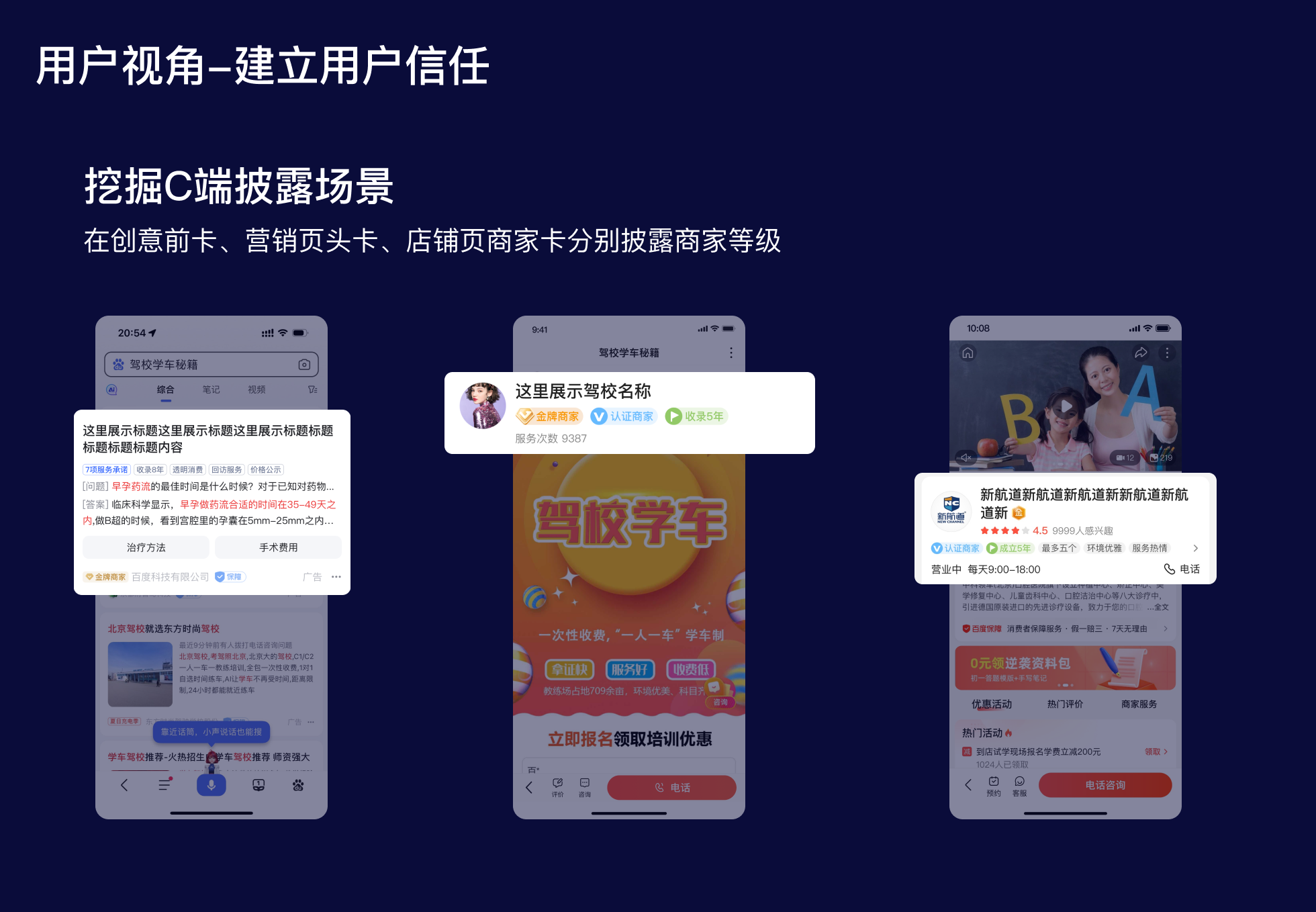 從用戶視角出發(fā),商家等級項目的主要目標(biāo)是建立用戶信任,所以設(shè)計師在強化徽標(biāo)設(shè)計的同時,更需要挖掘用戶視角的披露場景,通過增加C端披露,幫助用戶了解該商家在百度生態(tài)內(nèi)的等級情況,以輔助用戶決策。本項目中在C端共新增3個場景進行商家等級的披露,①搜索前卡;②營銷頁頭卡;③店鋪頁首卡。在3個重點場景披露商家的等級徽標(biāo),用戶在選擇商家時可以參考商家的等級,增強對商家的信任和認知。