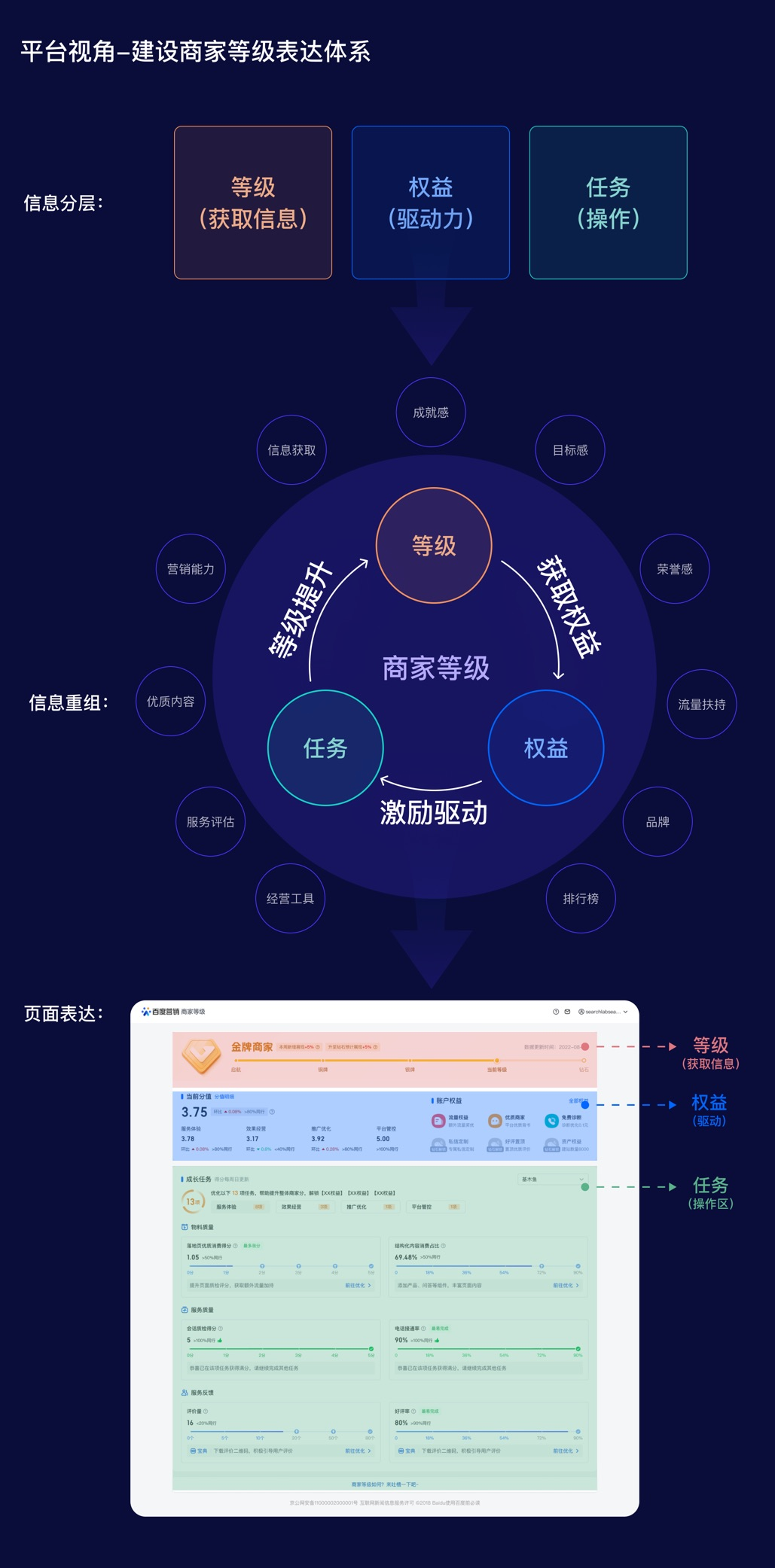 信息分層:開始頁面設(shè)計之前需要設(shè)計信息結(jié)構(gòu)和組織方式,以便商家可以輕松找到需要的信息。以商家等級為例,首先根據(jù)信息價值將信息分為<等級-權(quán)益-任務(wù)>三大類(等級作銜接、權(quán)益提供驅(qū)動力、任務(wù)是需完成的動作)。