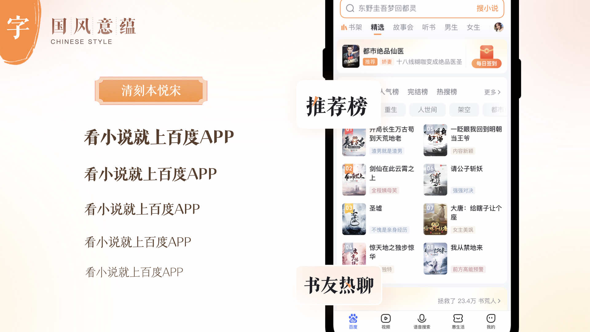 基于國風(fēng)意韻感,設(shè)計團隊在文字的使用上,也選擇了一套襯線體字體,該字體字形瘦長,柔美清透且識別度高。在界面中,主要在標(biāo)題區(qū)應(yīng)用這套字體,將其中的一筆進行跳色點綴,不僅讓用戶閱讀舒適,而且提升百度小說的品牌識別度。