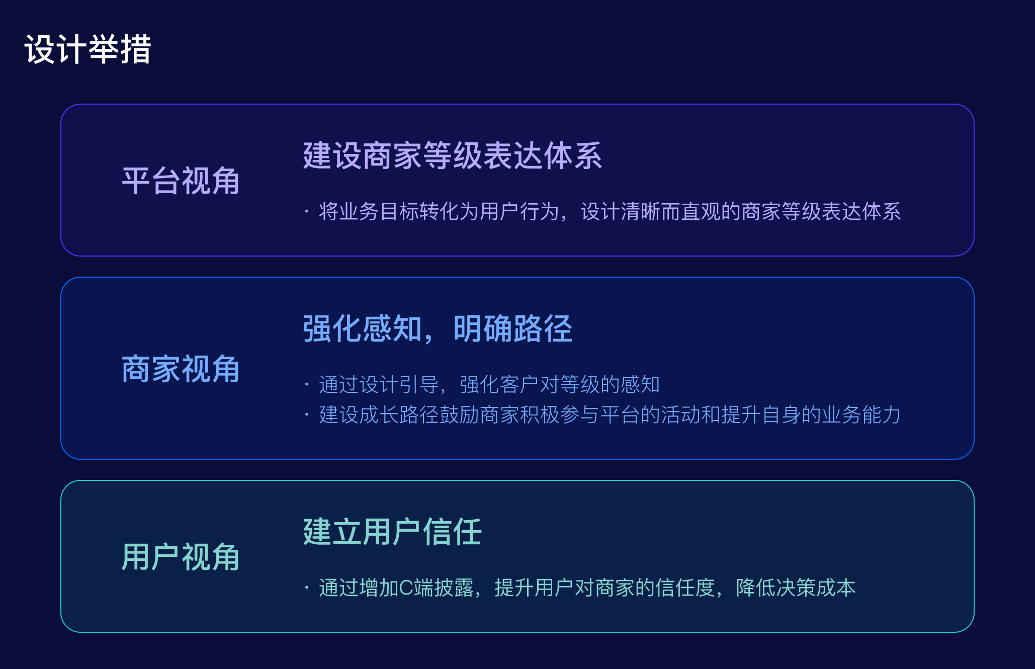 綜合以上分析,設(shè)計舉措應(yīng)注重建立商家等級表達、強化商家的感知和增強用戶的信任。希望通過設(shè)計目標(biāo)的實現(xiàn),為商家分層模型帶來更好的用戶體驗和商業(yè)效益,提升商家的參與度和忠誠度,促進商業(yè)生態(tài)飛輪的正向運轉(zhuǎn)。