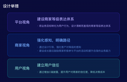 設(shè)計的基本出發(fā)點是幫助業(yè)務(wù)建設(shè)平臺等級模型的表達體系,將業(yè)務(wù)目標(biāo)轉(zhuǎn)化為用戶行為,設(shè)計清晰而直觀的商家分層表達體系,將不同商家等級與其對應(yīng)的特權(quán)、服務(wù)等信息進行明確的關(guān)聯(lián)和傳達,以便商家能夠快速理解和辨識商家等級的差異和優(yōu)勢。