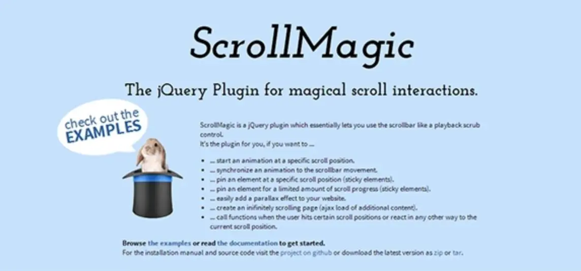 二、插件名稱(chēng):ScrollMagic 簡(jiǎn)介:ScrollMagic是一個(gè)強(qiáng)大的滾動(dòng)動(dòng)畫(huà)插件,它能夠?yàn)榫W(wǎng)頁(yè)添加各種視差效果和動(dòng)畫(huà)效果。設(shè)計(jì)師可以利用ScrollMagic創(chuàng)建吸引人的滾動(dòng)交互效果,使用戶(hù)在瀏覽頁(yè)面時(shí)獲得更好的體驗(yàn)。該插件支持多種觸發(fā)方式和動(dòng)畫(huà)選項(xiàng),具有良好的性能和可擴(kuò)展性。