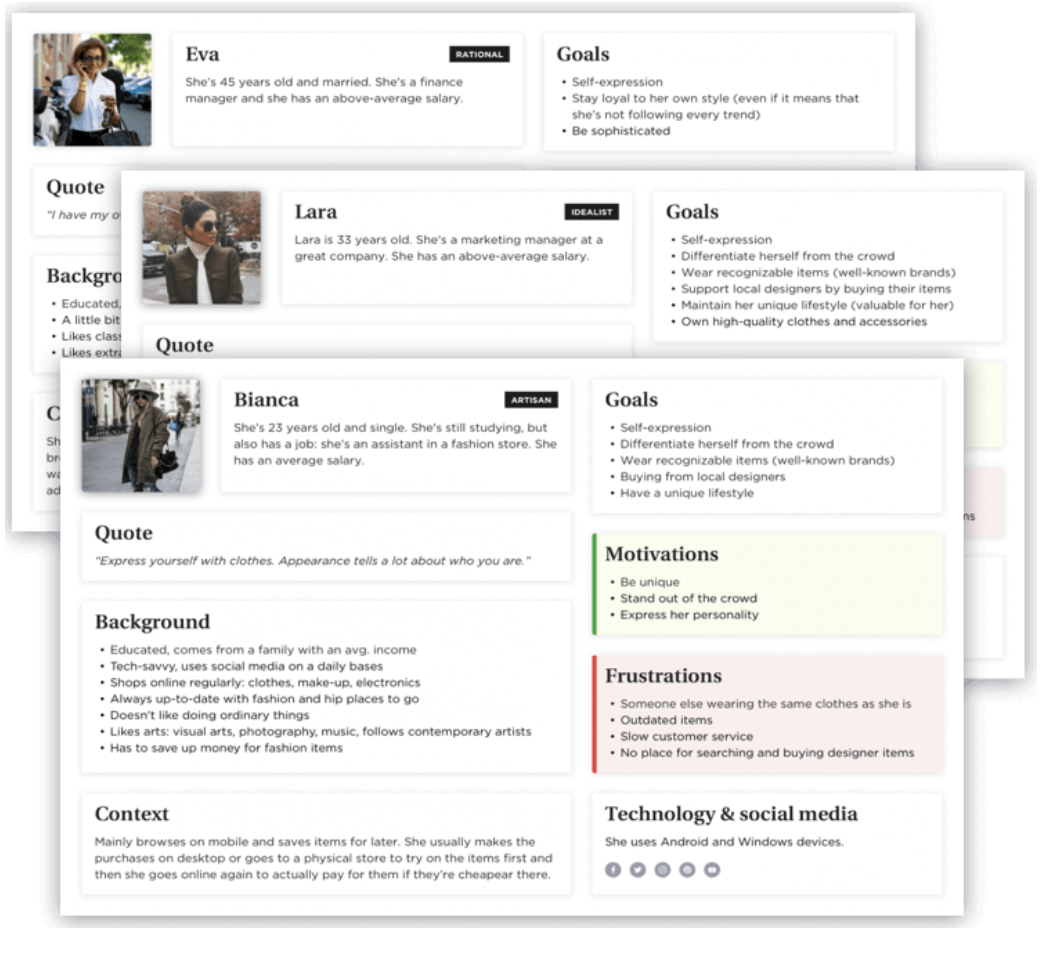 按照我們的邏輯順序,首先是創(chuàng)建角色。我們幾乎在所有項(xiàng)目中都會(huì)使用。基于我們的產(chǎn)品或服務(wù)的目標(biāo)群體,即不同的潛在客戶,構(gòu)建虛構(gòu)人物個(gè)性。這個(gè)工具可以讓我們更多地了解客戶的需求、問題、動(dòng)機(jī)和行為。我們通過研討會(huì)、頭腦風(fēng)暴或通過定性和定量研究“簡單地”收集盡可能多的數(shù)據(jù)來實(shí)現(xiàn)這一目標(biāo)。