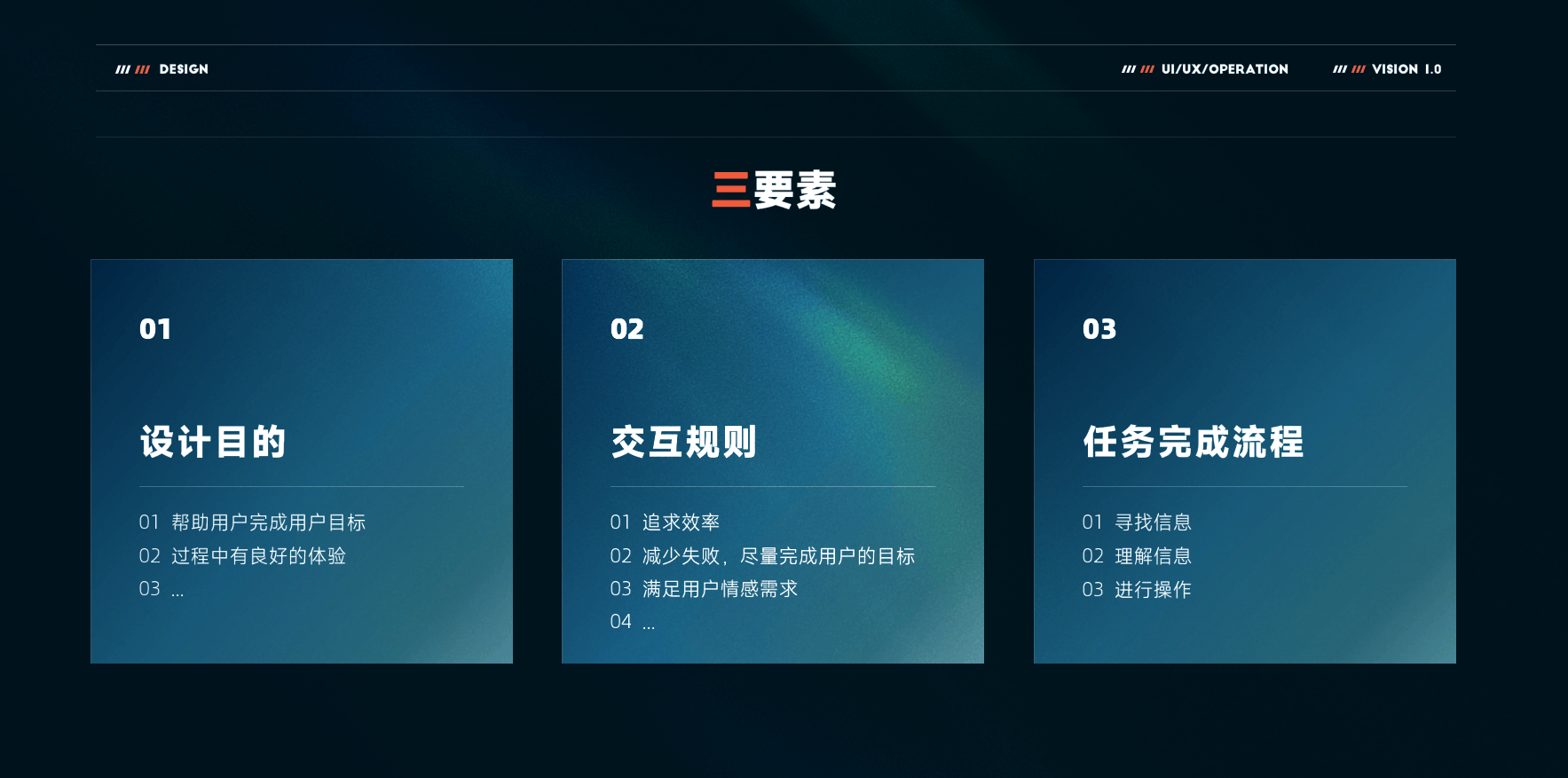 這里說的三要素分別為 設(shè)計目的、交互規(guī)則、完成任務(wù)過程。(三要素的定義說明都以簡單化的去舉例,主要展示整體的思維方法)
