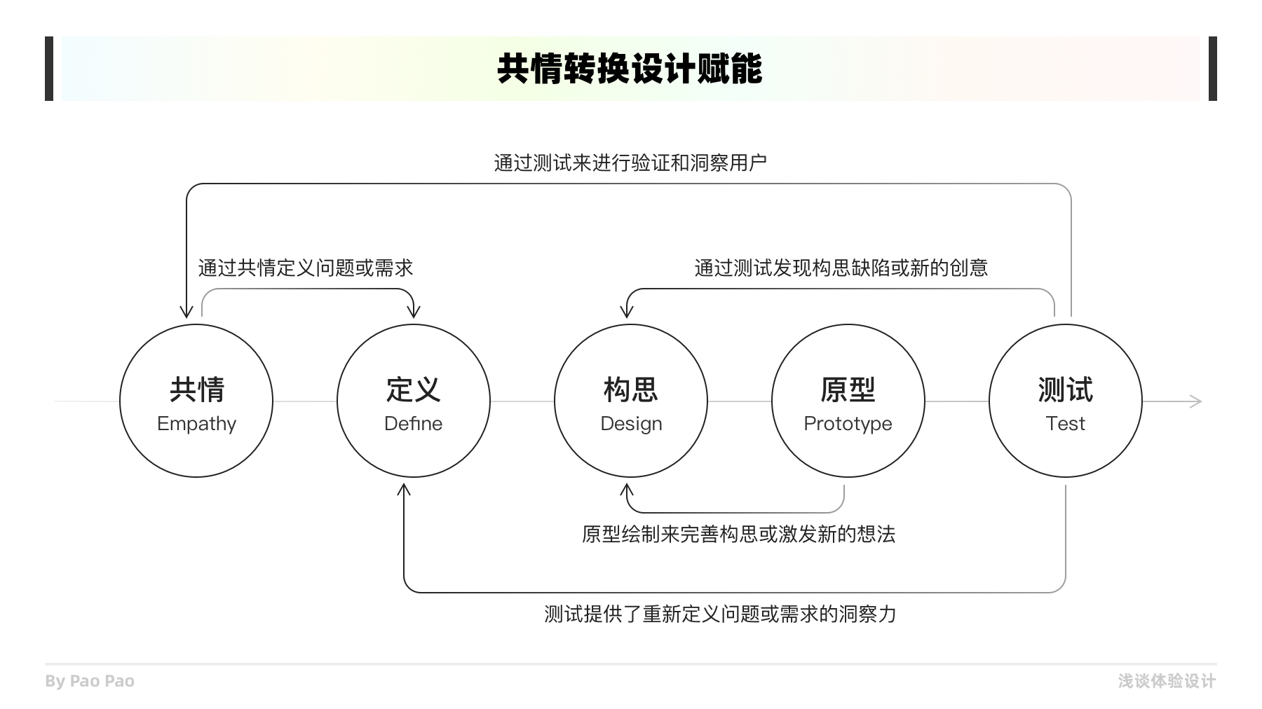 最后便是共情結(jié)果如何應用到設計之中,將共情結(jié)果賦能到產(chǎn)品設計也是共情工作的價值所在。通常這套流程是共情->定義->構(gòu)思->原型->測試,在這個整個過程中隨時是可以返回到前面其他階段中反復打磨的,而共情作為一個起點也揭示了其重要性。我們一切的共情工作皆為了能夠優(yōu)化和解決產(chǎn)品的問題,使得產(chǎn)品體驗能夠更好,這是我們在體驗設計中不斷去共情的初衷。