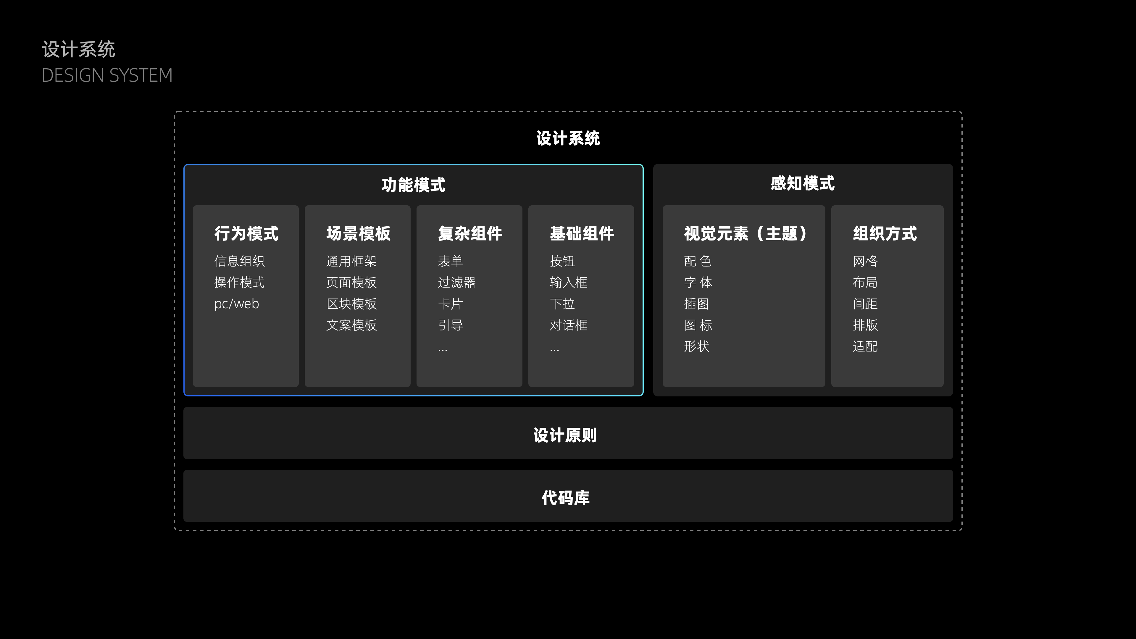 大多數(shù)日常需求大多是從單點出發(fā),當點變多變復雜了,就容易出現(xiàn)上述說到的現(xiàn)狀問題。所以解決方案需要基于業(yè)務全盤進行設計抽象:從元素——組件——區(qū)塊——頁面——功能流程沉淀設計規(guī)則并代碼化,來靈活提供拼裝N個不同頁面的機制,幫助團隊更系統(tǒng)化的進行產品設計。從組成內容不難看出,解決方案是需要建立在基礎組件基礎上,與基礎組件、復雜組件、行為模式共同組成設計系統(tǒng)的【功能模式】部分。