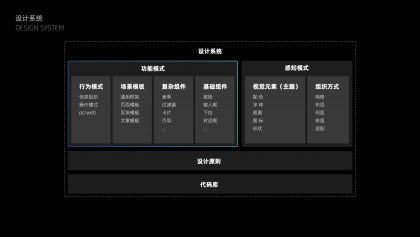 所以如何解決團隊效率和產品質量問題?我們的解法是抽象體系化的解決方案:設計模式化和代碼化,設計從原子到全局進行統(tǒng)一和優(yōu)化,并形成系統(tǒng)化的設計指導,由開發(fā)進行模式代碼化,提供靈活可配置的規(guī)則。以此,設計有更系統(tǒng)化的設計原則,整體的統(tǒng)一性和體驗有保障,設計和開發(fā)周期也可以縮減,甚至大部分日常需求可直接由產品對接開發(fā)直接上線。