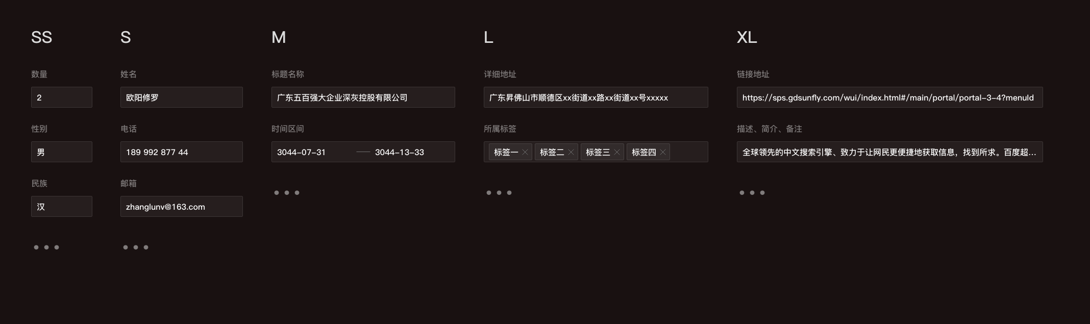 超短(XS):用于短數(shù)字、超短文本 短(S):適用于較短文本輸入,如個(gè)人信息(姓名、電話(huà)、郵箱等) 標(biāo)準(zhǔn)(M):默認(rèn)輸入框長(zhǎng)度,適用大多數(shù)情況 長(zhǎng)(L):適用較長(zhǎng)文本輸入,如網(wǎng)頁(yè)地址、標(biāo)簽組等 超長(zhǎng)(XL):適用超長(zhǎng)文本輸入如正文(描述信息、備注、摘要、介紹、備注)、超長(zhǎng)鏈接等選擇合適的輸入框?qū)挾瓤梢詫?duì)使用者產(chǎn)生一定的心理暗示從而來(lái)減輕使用者的心理負(fù)擔(dān),因?yàn)樵诳吹阶侄螛?biāo)題時(shí),心理都會(huì)產(chǎn)生對(duì)所填信息的預(yù)期,大概我要填寫(xiě)什么,如果選用的輸入框?qū)挾炔缓线m一方面會(huì)對(duì)使用者造成一定的填寫(xiě)負(fù)擔(dān),同時(shí)還會(huì)對(duì)用戶(hù)產(chǎn)生一定程度的誤導(dǎo)。比如:填寫(xiě)戶(hù)籍所在地時(shí),如果輸入框給的太寬就會(huì)疑惑,到底應(yīng)該寫(xiě)“xx省xx市”、還是應(yīng)該填到具體“省-市-區(qū)-街道-xx號(hào)”呢?當(dāng)遇到更復(fù)雜的場(chǎng)景和混排輸入框的情況,為了讓頁(yè)面呈現(xiàn)的內(nèi)容更加有序、整齊,可參照山歌系統(tǒng)的定義方式來(lái)定義5種梯度寬度,從而方便設(shè)計(jì)執(zhí)行和技術(shù)開(kāi)發(fā)。比如定義為 A=超短(XS)的寬度;短(S)的寬度=2A+n;以此類(lèi)推