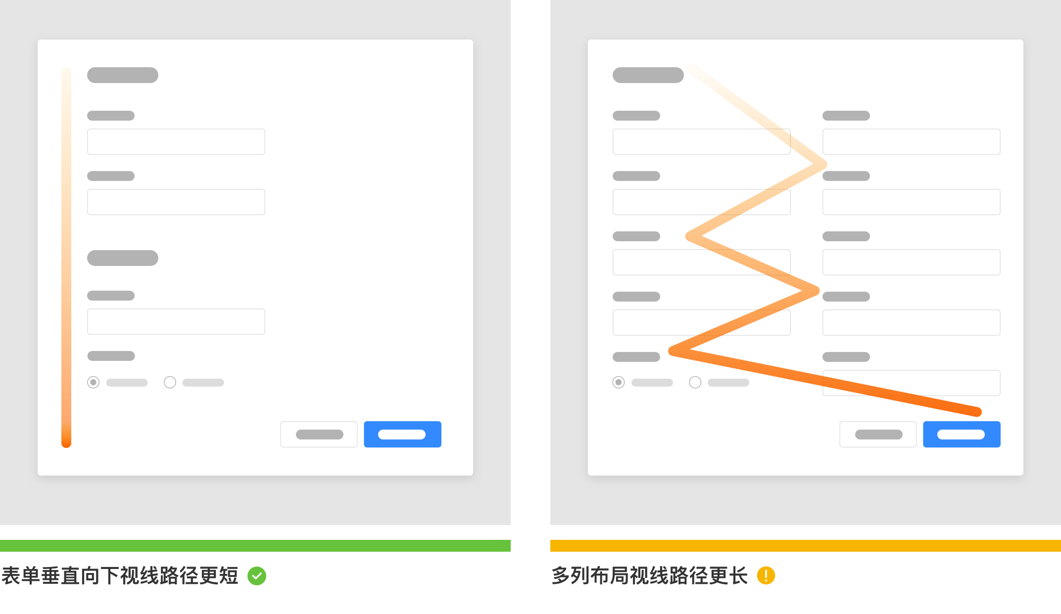 多列表單字段會導(dǎo)致用戶視覺路徑變長,因為如果表單中有水平相鄰的字段,則用戶必須以Z樣式進(jìn)行視線掃描,整體的效率和工作量都更大,使清晰的路徑變得模糊并加長用戶閱讀時間。多列表單可能會存在用戶跳過他們實際要輸入的必填字段,將數(shù)據(jù)輸入到錯誤字段中。而最終校驗信息時用戶得反復(fù)檢查錯誤項導(dǎo)致用戶放棄填寫。