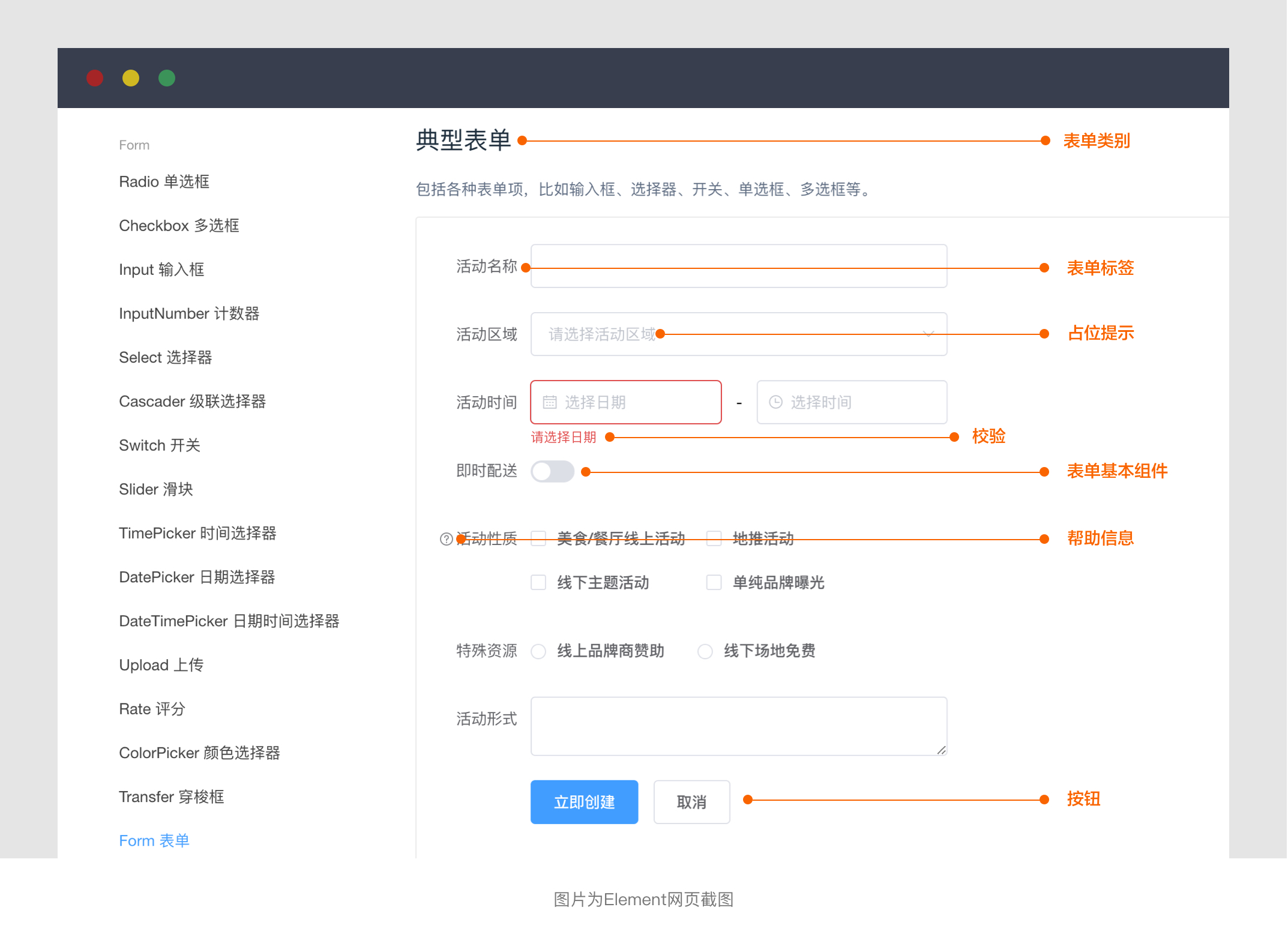 表單組件:包含了輸入框、下拉框、日期選擇器、時間選擇器、開關(guān)、上傳等十幾種類型,是形成表單的核心內(nèi)容;