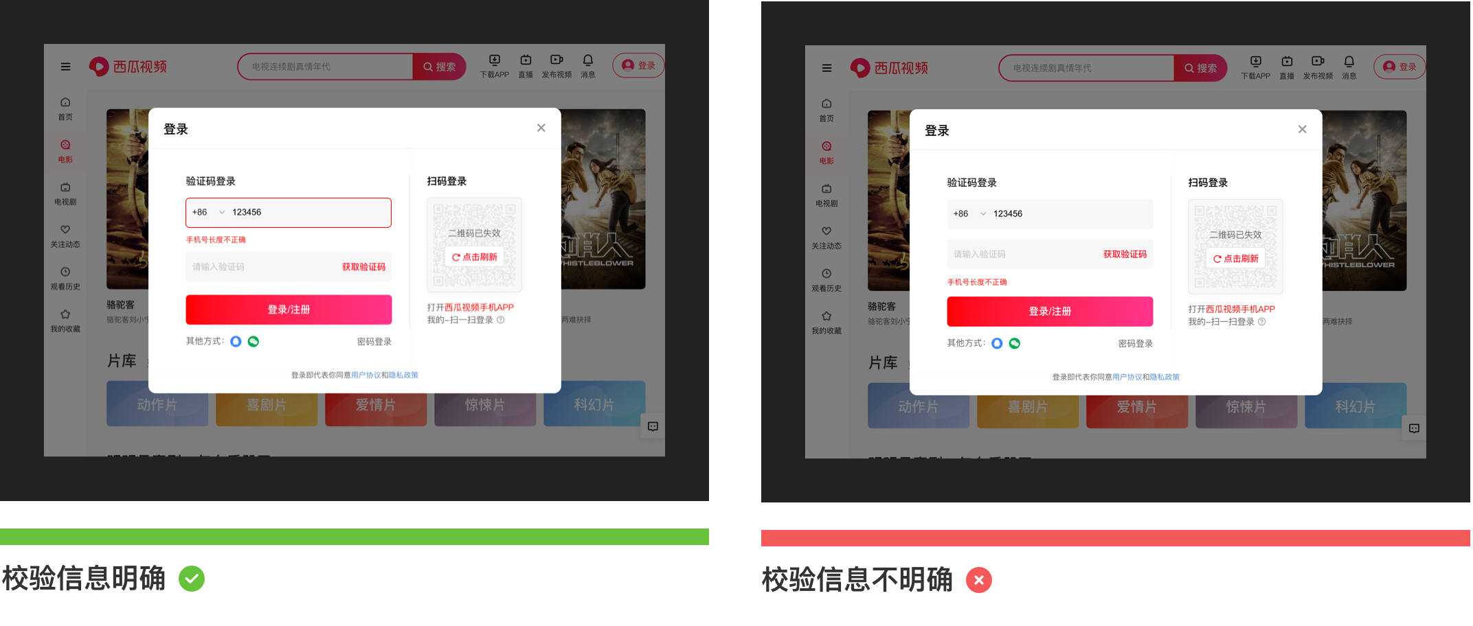錯誤校驗提示一般存在于錯誤率較高情況下出現(xiàn),如:在登錄注冊時,要求用戶填寫手機(jī)號,如果用戶輸入的手機(jī)號碼不符合特定的輸入格式,那么這時候需要明確標(biāo)記錯誤原因,準(zhǔn)確的幫助用戶找到問題并解決,避免錯誤提示描述模糊不清誤導(dǎo)用戶。錯誤提示一般會采用“雙重視覺強調(diào)”來顯示錯誤,除了輸入框突出顯示外,同時需要在輸入框下方加入紅色指導(dǎo)文字。如下圖所示為西瓜視頻登錄注冊場景下的截圖: