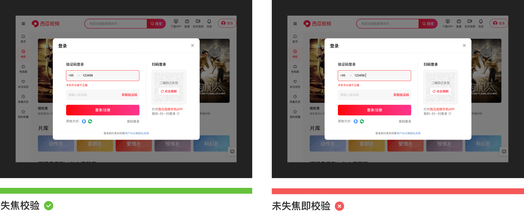 為了避免用戶在提交時表單時出現(xiàn)大面積的報錯問題,設(shè)計師可以使用實時校驗的交互形式。如:在用戶輸入完成之后鼠標(biāo)失焦后進(jìn)行信息校驗,但是需要注意的是在實時校驗時避免用戶還沒有輸入完成即出現(xiàn)校驗誤導(dǎo)用戶,所以需要準(zhǔn)確判斷鼠標(biāo)是否失焦。如下圖所示為西瓜視頻登錄注冊場景下的截圖:
