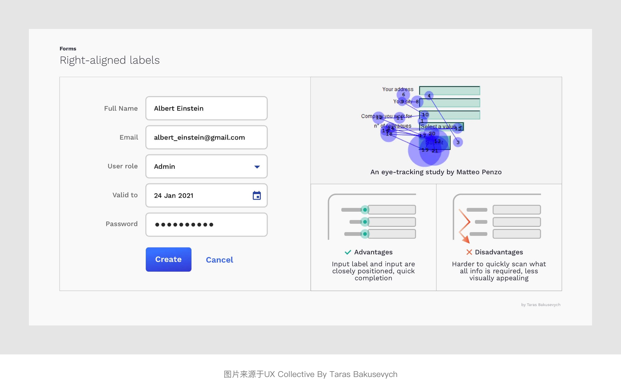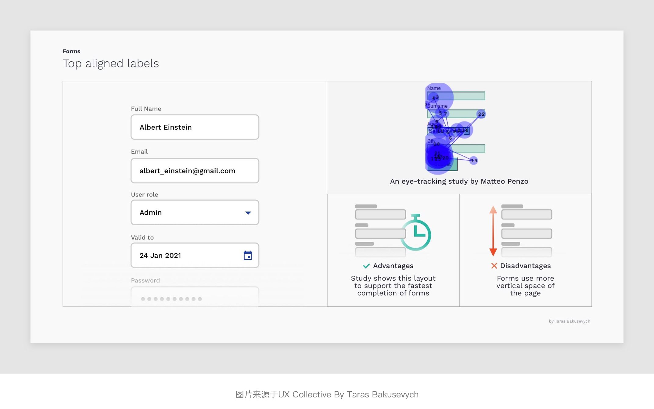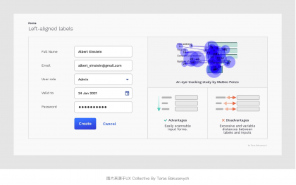 將表單標(biāo)簽放置在其對應(yīng)輸入字段的正上方,并垂直左對齊排列,用戶只需依次向下瀏覽即可看到標(biāo)簽與輸入字段兩個元素。其優(yōu)勢是橫向屏幕空間足夠,能夠比較友好的適配多語言適合非中國區(qū)業(yè)務(wù)表單使用。并且根據(jù)上面Matteo Penzo的時間表上看,頂部對齊的瀏覽和填寫的效率也是3種常規(guī)的對齊方式中較高的一種。不足點是會占用較多的縱向垂直屏幕空間,此外應(yīng)當(dāng)注意每組表單標(biāo)簽和輸入字段與其他字段組的間距,以免層級區(qū)分度不夠的問題。