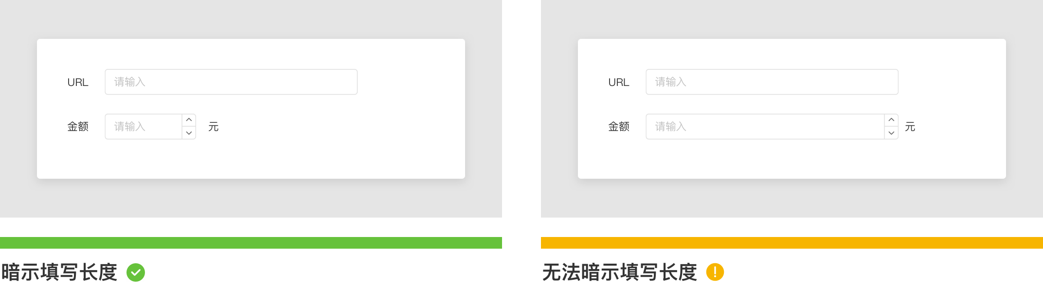 在實際業(yè)務(wù)中,設(shè)計師常常習(xí)慣把每個表單字段都設(shè)置成相同的寬度,在視覺效果上看感覺會比較統(tǒng)一,但是這種做法實際上體驗欠佳。字段的寬度應(yīng)該向用戶暗示所需輸入內(nèi)容的長度從而減輕判斷負(fù)擔(dān)。在Ant Design 4.0 系列分享的文章《整齊劃一?不如錯落有致》中分析到錯落有致的排版表現(xiàn)似乎比整齊劃一的左圖更舒適,因為在視覺上我們更容易將右圖的空間和內(nèi)容視為一個和諧的整體。但左圖過度的對齊導(dǎo)致暗示隱性的截斷,我們慣性視覺會產(chǎn)生表單字段右側(cè)空間缺了一大塊的錯覺。