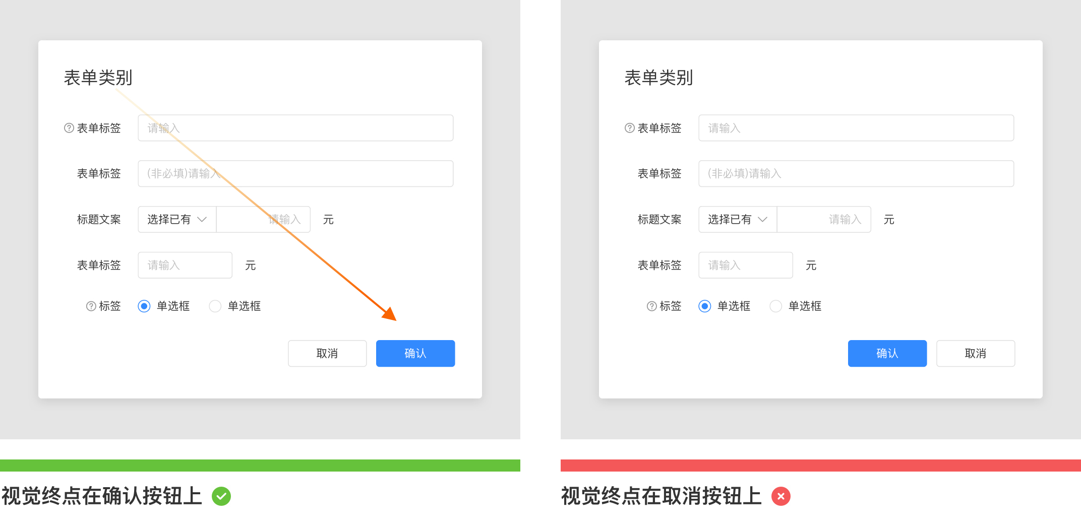 如下圖是一個彈窗類型的表單,如果根據(jù)業(yè)務(wù)訴求確認(rèn)操作重要程度強于取消操作,那么確認(rèn)按鈕應(yīng)該放在取消按鈕的右邊。因為確認(rèn)按鈕放在右側(cè)(終點區(qū)) 用戶關(guān)注度會更強。