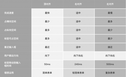 在設(shè)計表單時到底是左對齊、右對齊還是頂部對齊呢?這個問題也是在實際業(yè)務(wù)中設(shè)計師發(fā)問頻率較高的一個棘手問題。其實,不論是哪種方式都有相對的利弊,需要根據(jù)實際業(yè)務(wù)場景提供不同的解決方案。在Matteo Penzo《Label Placement in Forms》文章中有分享過關(guān)于表單標(biāo)簽放置的研究,下圖是Matteo Penzo研究總結(jié)得到的瀏覽時間表: