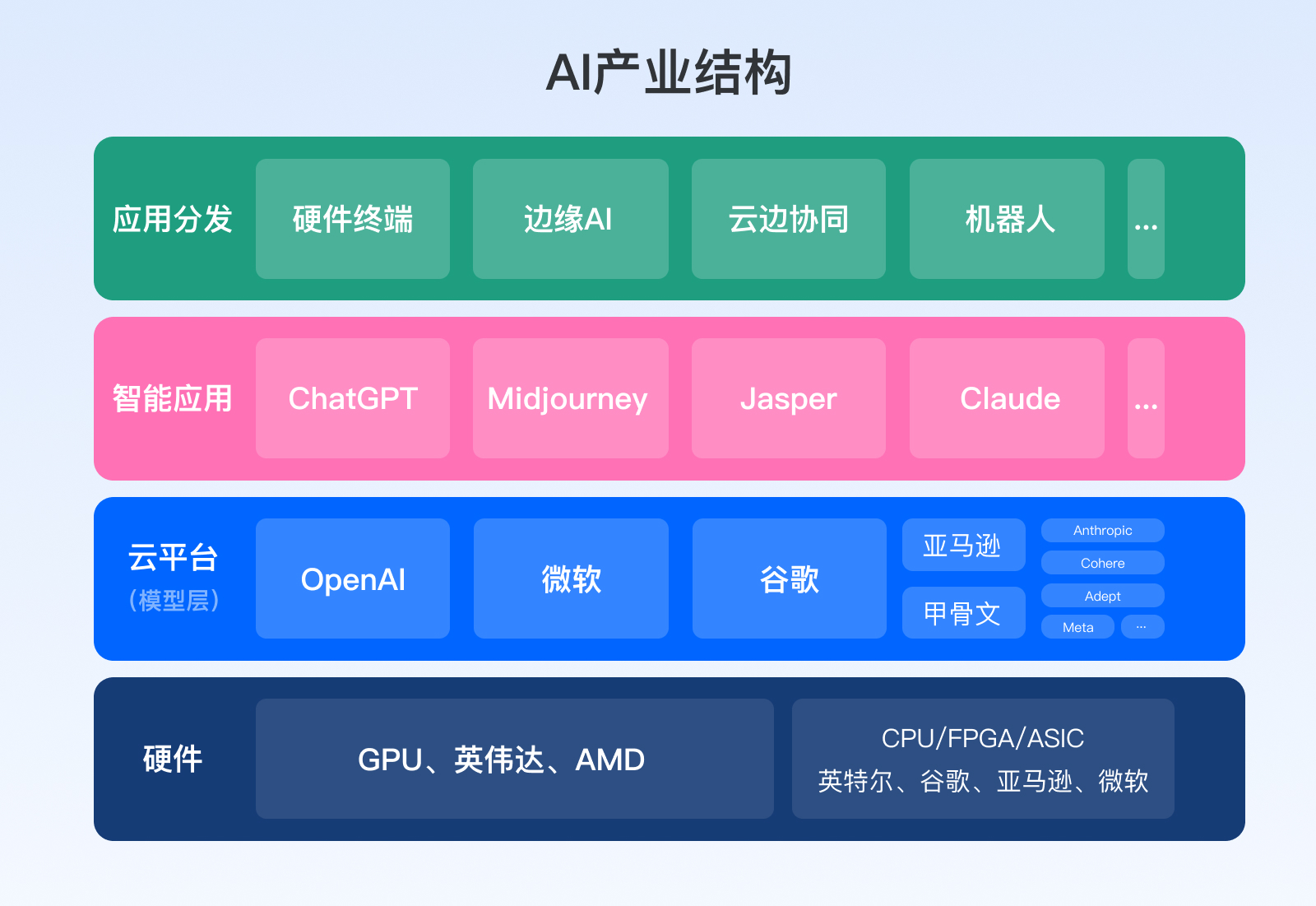 硬件、云平臺(tái)(模型層)、智能應(yīng)用、應(yīng)用分發(fā)構(gòu)成了AI整個(gè)產(chǎn)業(yè)鏈條,站在產(chǎn)業(yè)格局的角度看,算力很重要、硬件卻并非關(guān)鍵。這輪變革最大的機(jī)會(huì)在應(yīng)用層面,所以大量涌現(xiàn)出智能應(yīng)用,比如ChatGPT、Midjourney;以及各行各業(yè)基于大模型對(duì)AI能力接入,提升自己產(chǎn)品力或服務(wù)能力。