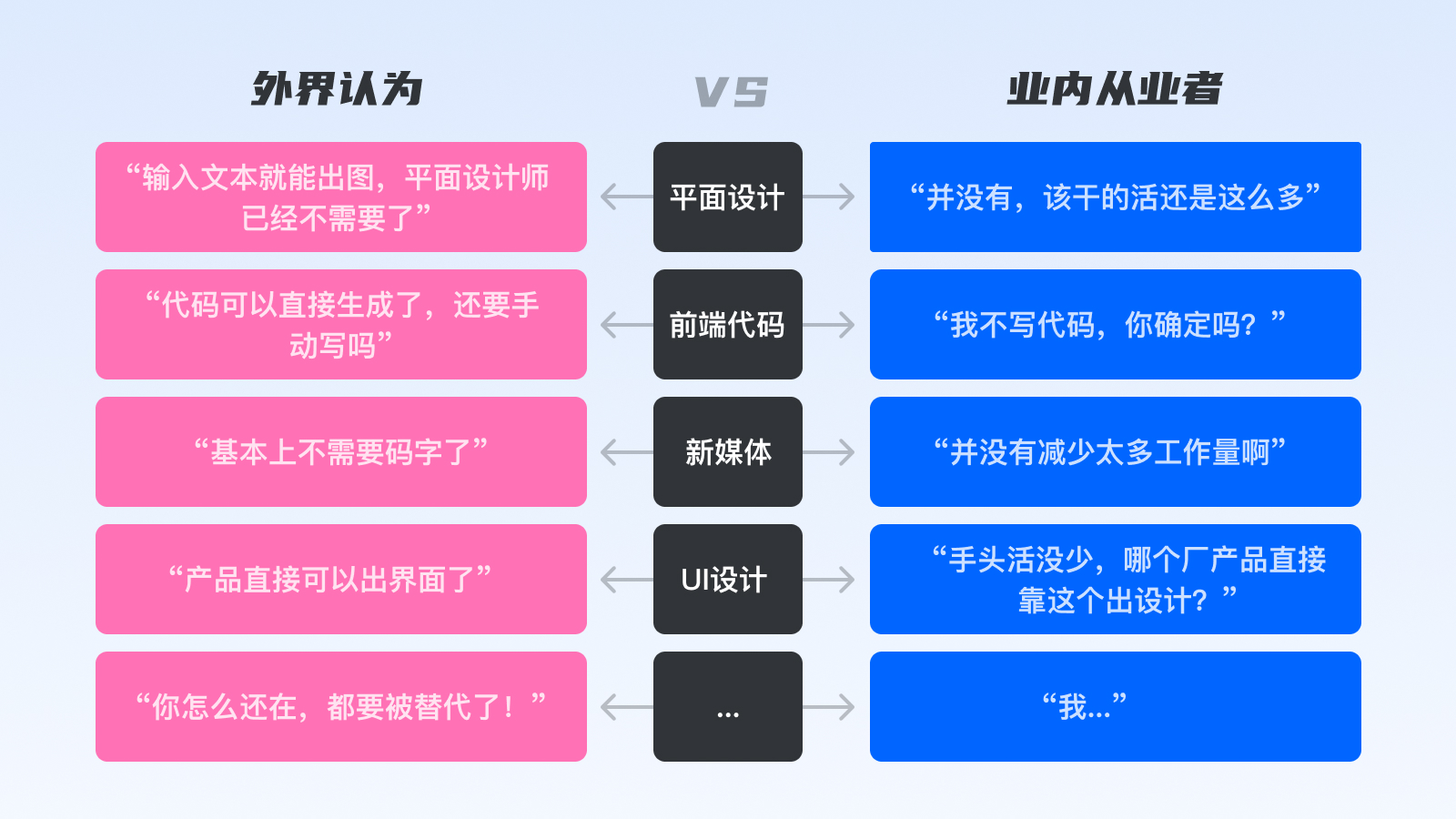 有個(gè)有趣的現(xiàn)象,不管是什么崗位,外界對(duì)AI的應(yīng)用程度,總比行業(yè)從業(yè)者要“樂(lè)觀”很多,比如UI、前端崗位,感覺(jué)已經(jīng)不太需要他們參與了。