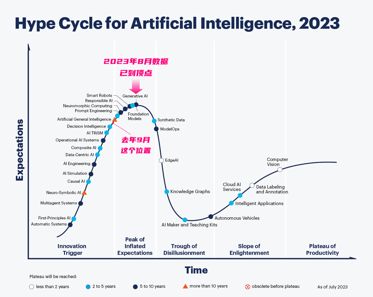 生成式AI到了技術(shù)發(fā)展從開(kāi)始走向期望的膨脹期,現(xiàn)象級(jí)產(chǎn)品已經(jīng)出現(xiàn);