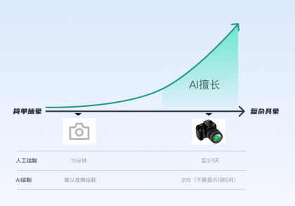 不考慮思考過(guò)程時(shí)間消耗,將人工手繪和AI繪制對(duì)比,AI可能無(wú)法穩(wěn)定的繪制靠左的相機(jī)圖形,但可以很快、較穩(wěn)定的繪制右邊的相機(jī),而人去繪制右邊相機(jī)可能需要至少一天時(shí)間,還不一定有AI效果好。