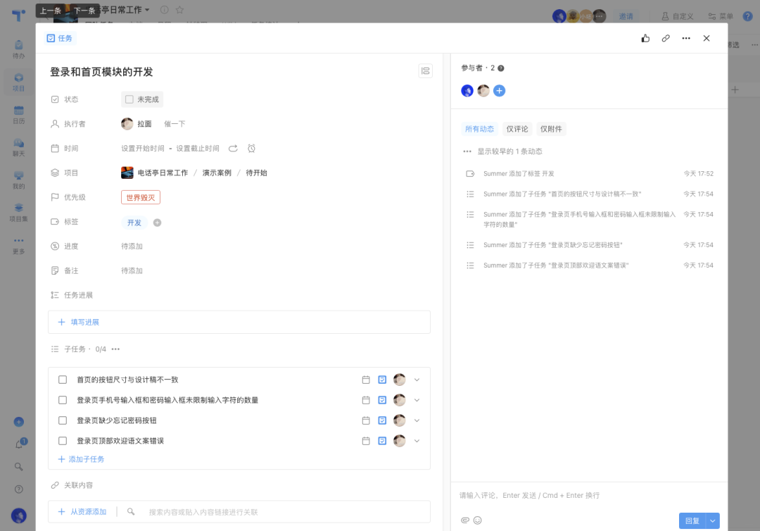 添加任務(wù)時(shí),可以用標(biāo)簽或標(biāo)題前綴,來(lái)區(qū)分設(shè)計(jì)還是開發(fā)的任務(wù)。這個(gè)創(chuàng)建的過(guò)程盡量在前面說(shuō)到的共識(shí)建立的溝通會(huì)議中進(jìn)行,并對(duì)每個(gè)任務(wù)內(nèi)添加實(shí)現(xiàn)的目標(biāo)和水平,以及對(duì)應(yīng)的負(fù)責(zé)人。