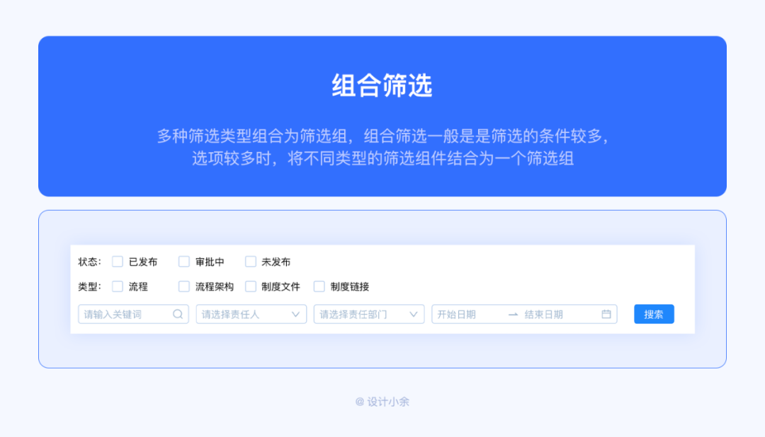 設(shè)計要點:由于這里包含多種篩選類型,名稱和編號是關(guān)鍵詞篩選,發(fā)布狀態(tài)和、責任人、責任部門、類型是選項篩選,發(fā)布日期是時間區(qū)間篩選。所以我們需要采用組合篩選的模式。