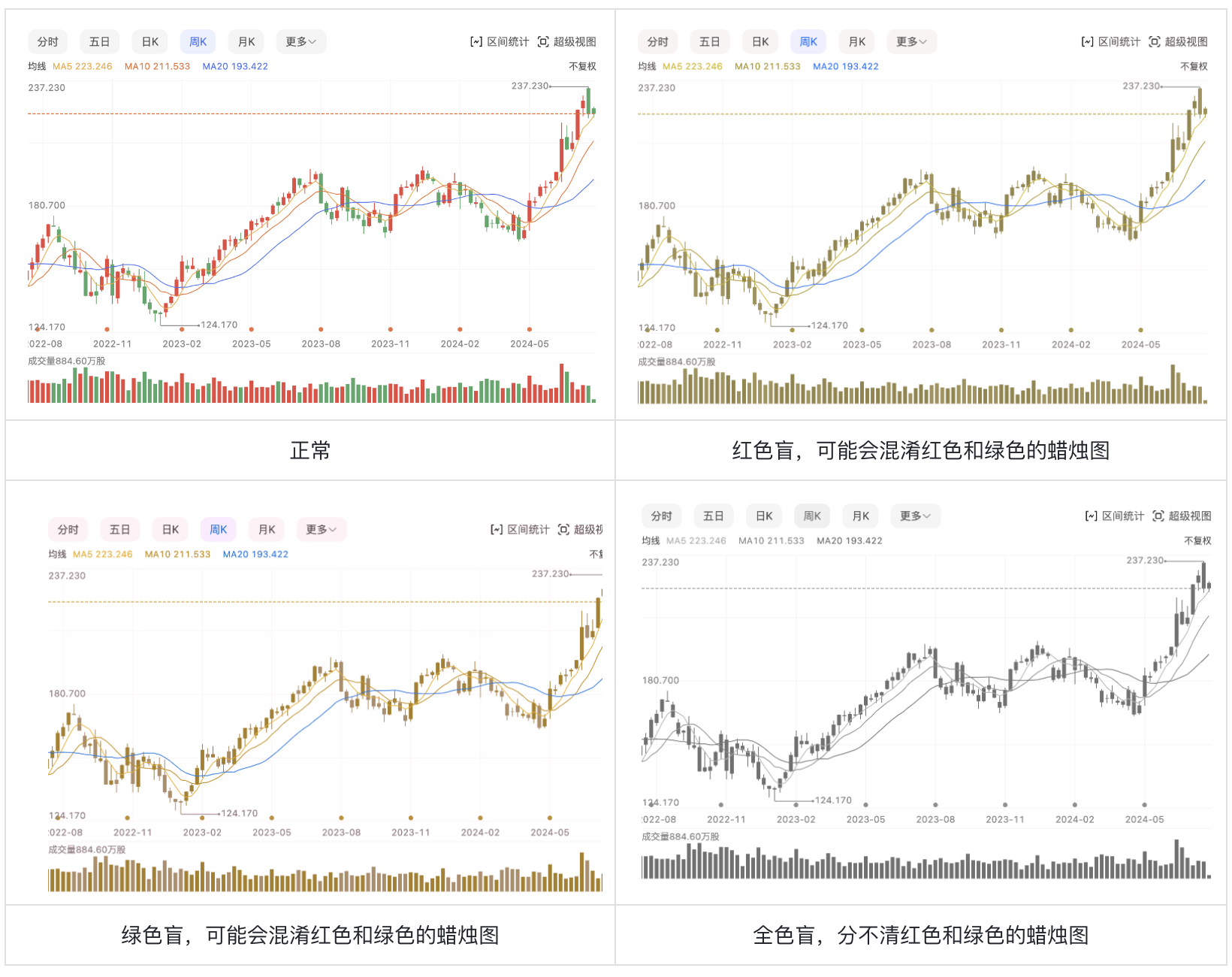 舉個(gè)例子,在個(gè)股詳情K線圖頁(yè)面,上漲用空心圖形表示,下跌用實(shí)心圖形表示,這種方法不僅幫助色盲用戶識(shí)別信息,還增加了視覺(jué)上的吸引力。