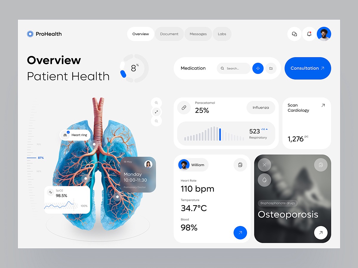 針對患者的醫(yī)療 UI 設計,功能重點在于信息查詢與服務獲取?;颊咝枰軌蚍奖愕夭樵冏约旱木驮\記錄、檢查報告、費用明細等信息,因此在患者端的醫(yī)療 APP 或醫(yī)院官網(wǎng)界面上,應設置專門的信息查詢?nèi)肟?,并以清晰易懂的方式呈現(xiàn)數(shù)據(jù)。同時,提供在線預約掛號、繳費、藥品配送等服務功能,實現(xiàn)就醫(yī)流程的線上化,減少患者排隊等待的時間。此外,一些健康管理功能也受到患者的歡迎,如個人健康檔案管理、疾病預防知識推送、康復訓練指導等。