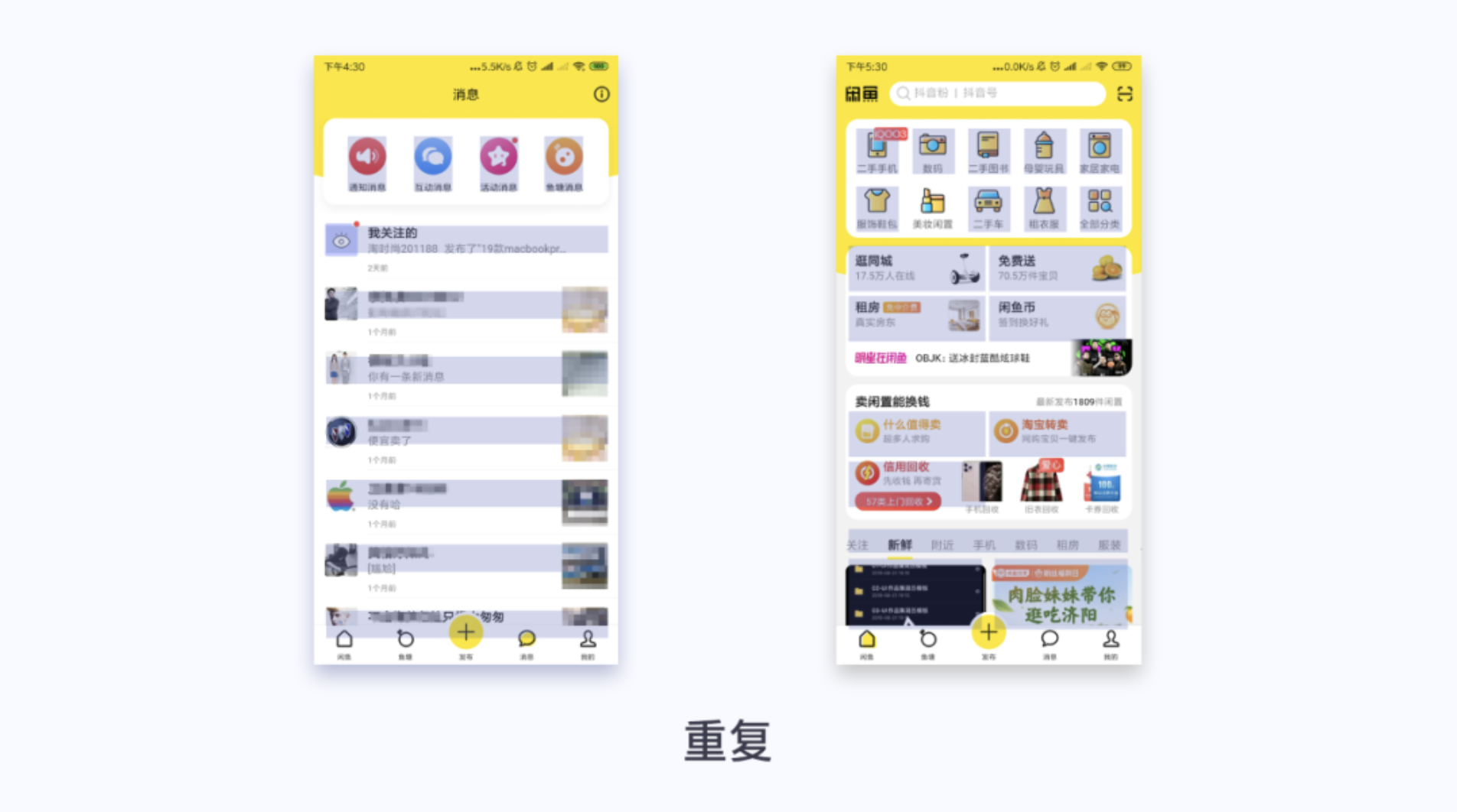 閑魚消息頁面,頭部功能區(qū)域圓形圖標重復,字體重復。消息列表頭像、名稱、消息、圖片重復,保持一致性,和統(tǒng)一。