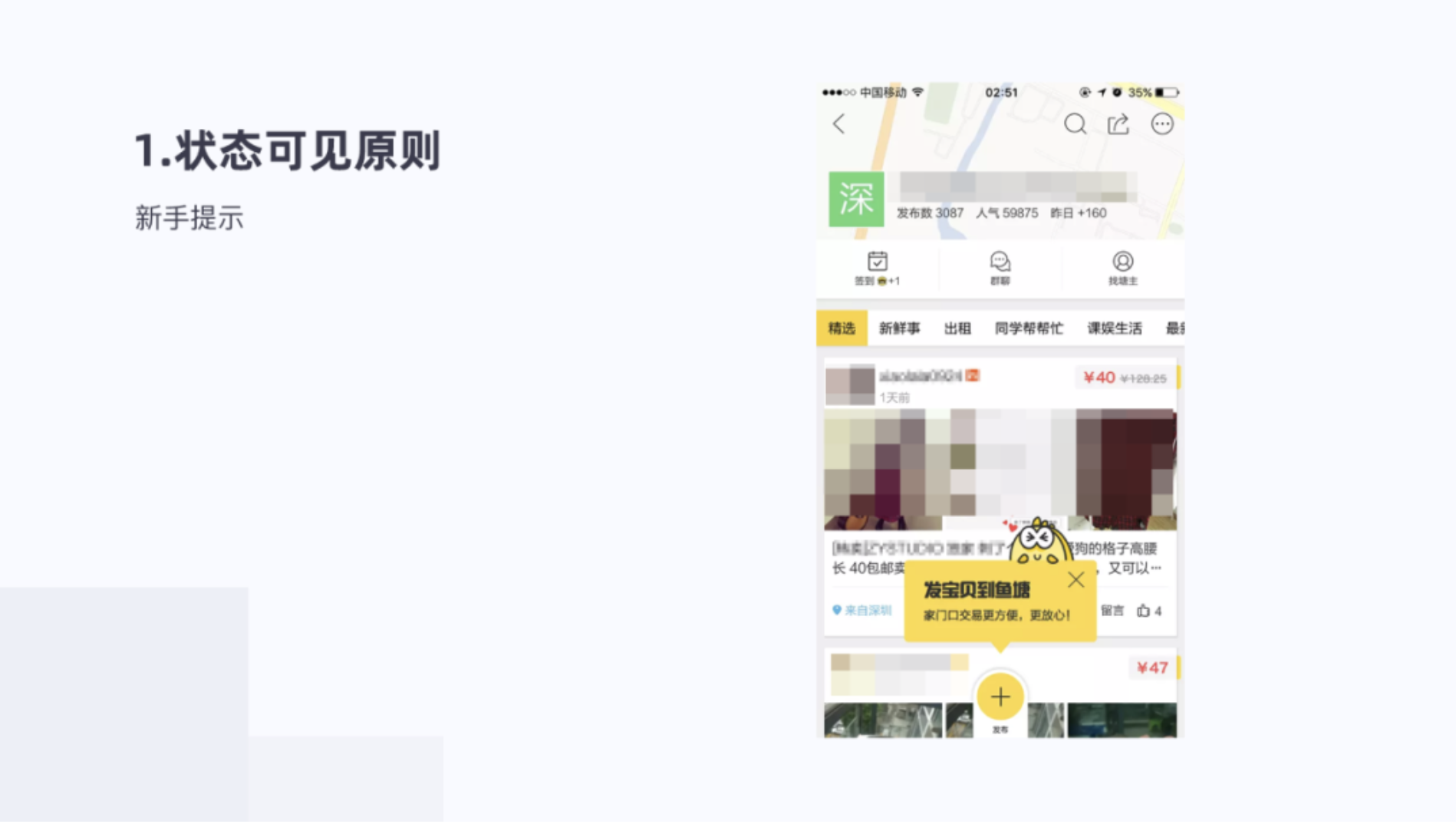 在閑魚頁面我們系統(tǒng)的標題欄、TAB欄的提示貫穿整體,用戶知道我們所處的什么頁面。比如認證提示,每一步告知用戶進行到哪里了。