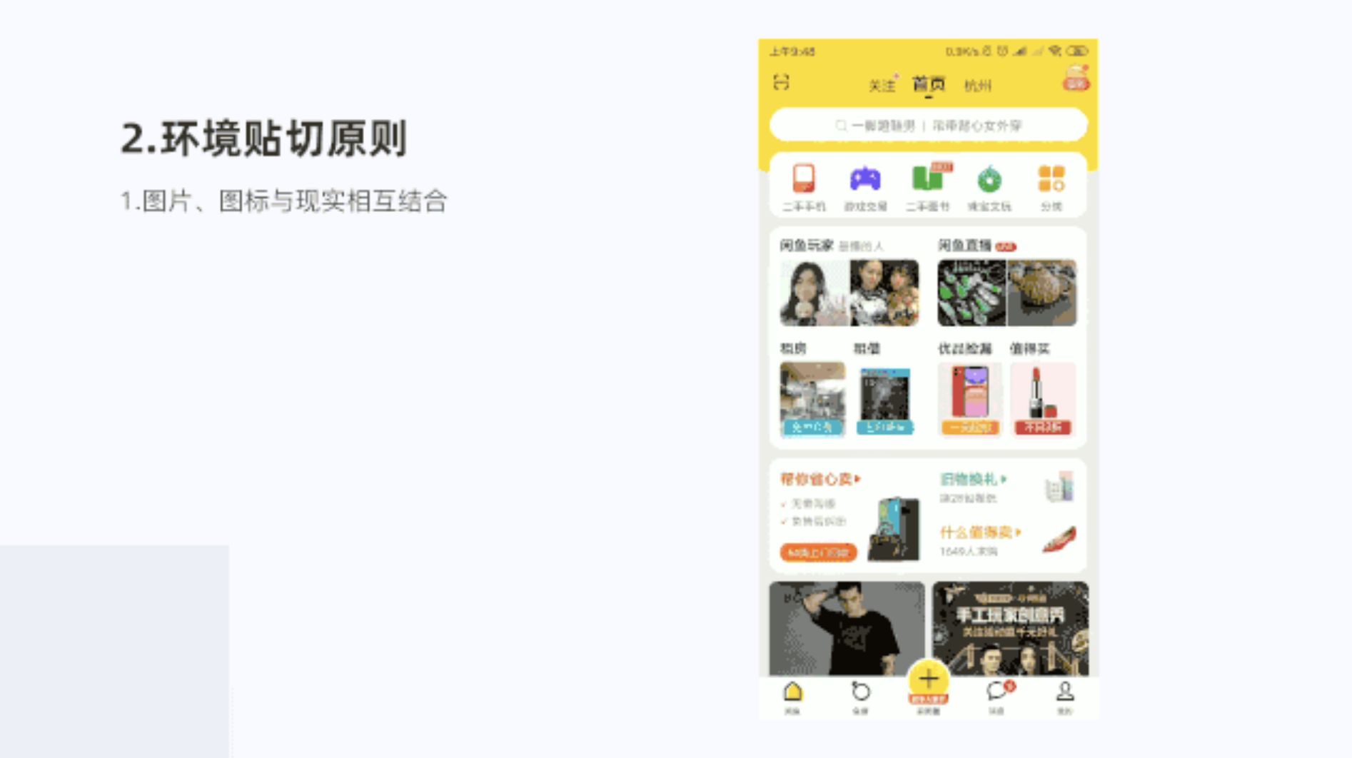在閑魚首頁功能頁面,二手手機圖標采用現(xiàn)實生活手機作為造型,游戲交易采用游戲手柄作為造型,二手圖書采用圖書翻頁形式作為造型,珠寶文玩采用珠寶玉器作為造型,符合用戶在現(xiàn)實生活中熟悉的東西,滿足認知,有良好體驗。