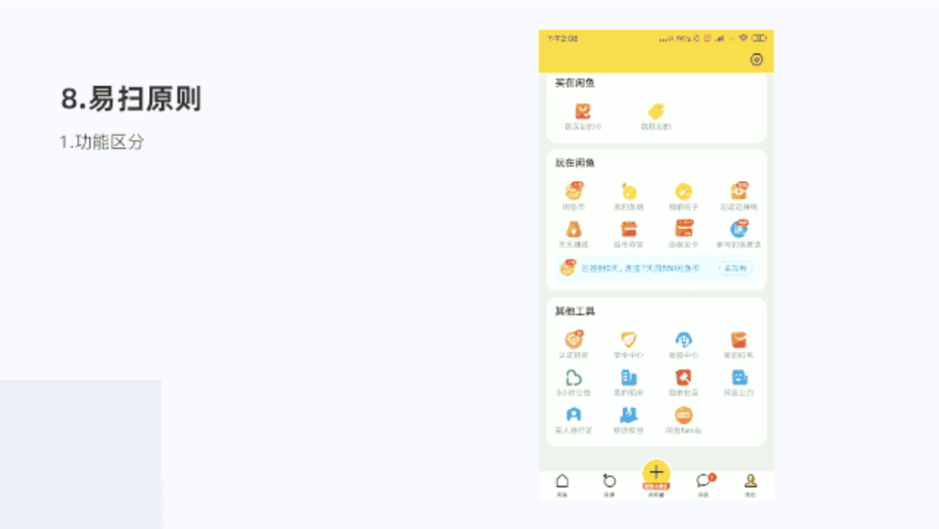 閑魚的我的頁面,每個區(qū)塊進行功能區(qū)分,分為買、賣、玩、其他4個主要部分。降調(diào)層級,同時在區(qū)塊內(nèi)每個功能圖標宮格顯示,也易于用戶查找,滿足了易掃原則,提示了用戶體驗。