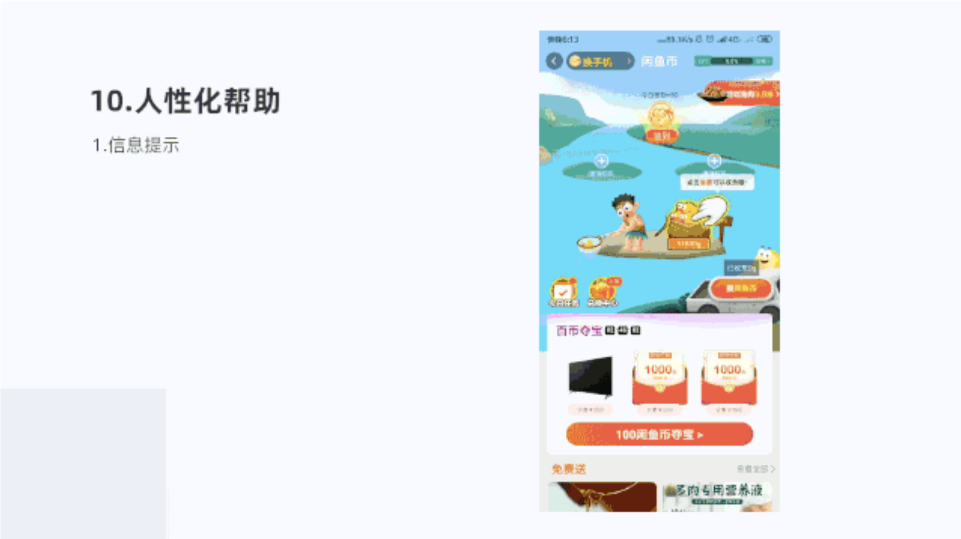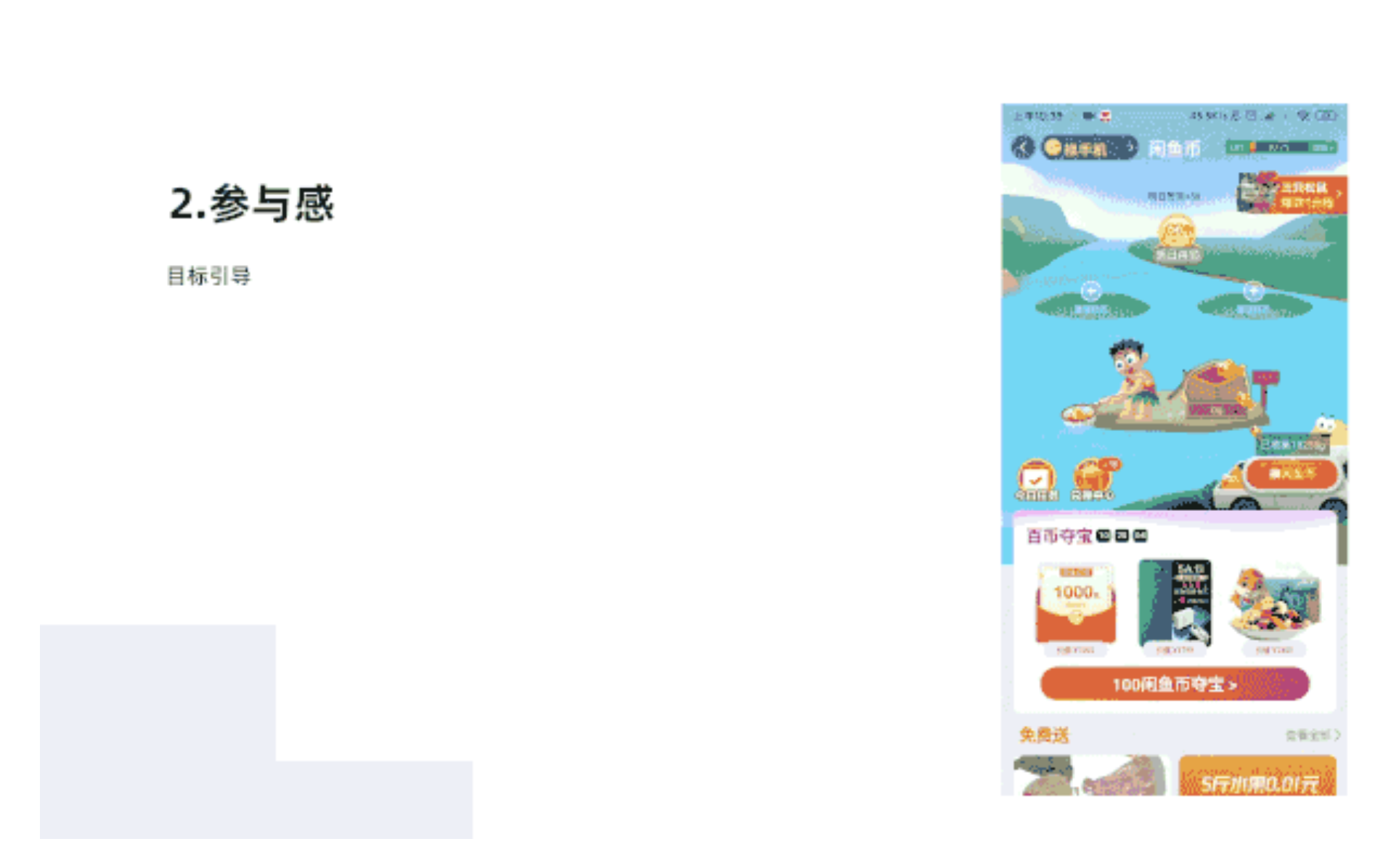 目標引導設計,劃定規(guī)則和目標路徑,引導用戶參與其中,在簽到活動頁面一個小路徑,用戶點擊撈魚,撈上來之后,就可以兌換閑魚幣了,讓用戶趣味游戲同時獲得閑魚幣,提升參與感,增強了用戶體驗。