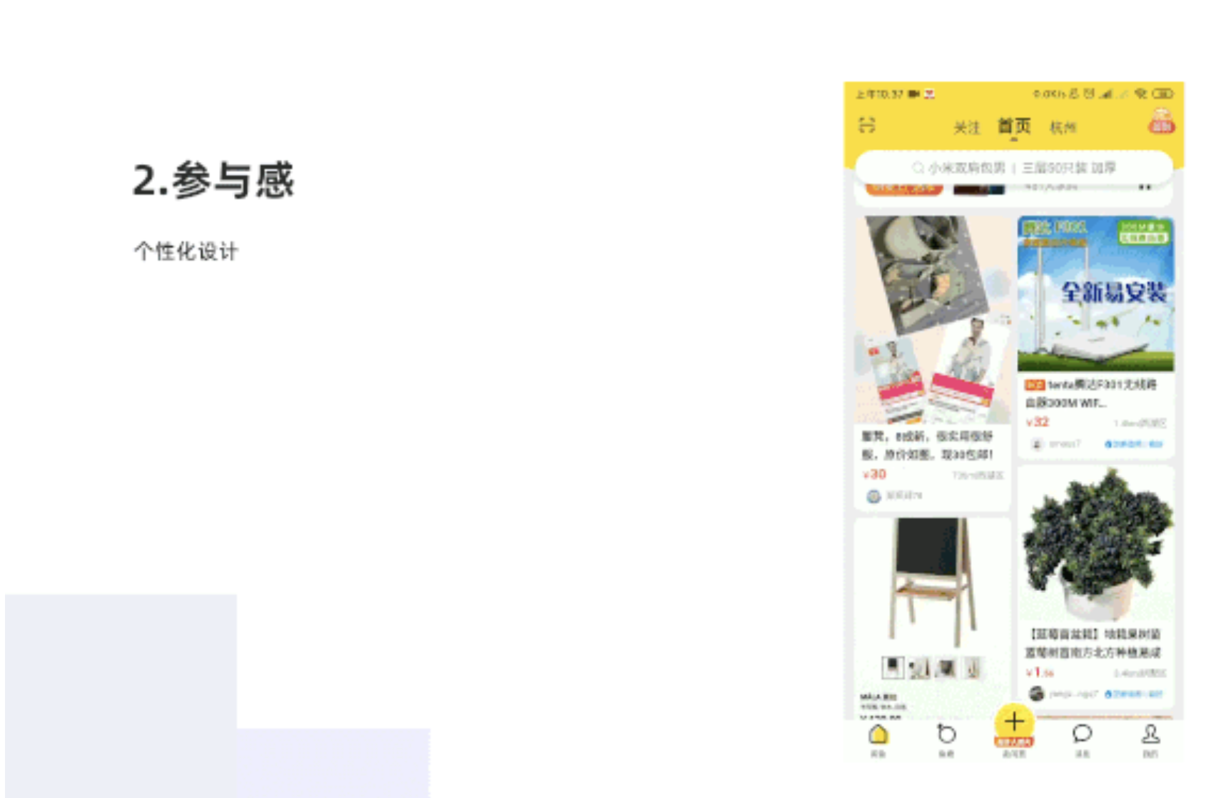 個性化設計,為用戶提供獨一無二的個性化設計,帶來個性化服務,滿足用戶對閑置產(chǎn)品的需求,也同時滿足用戶發(fā)布閑置同類商品可參考的需求。當用戶想購買閑置植物盆栽比較多時,首頁就會出現(xiàn)推薦的盆栽商品。
