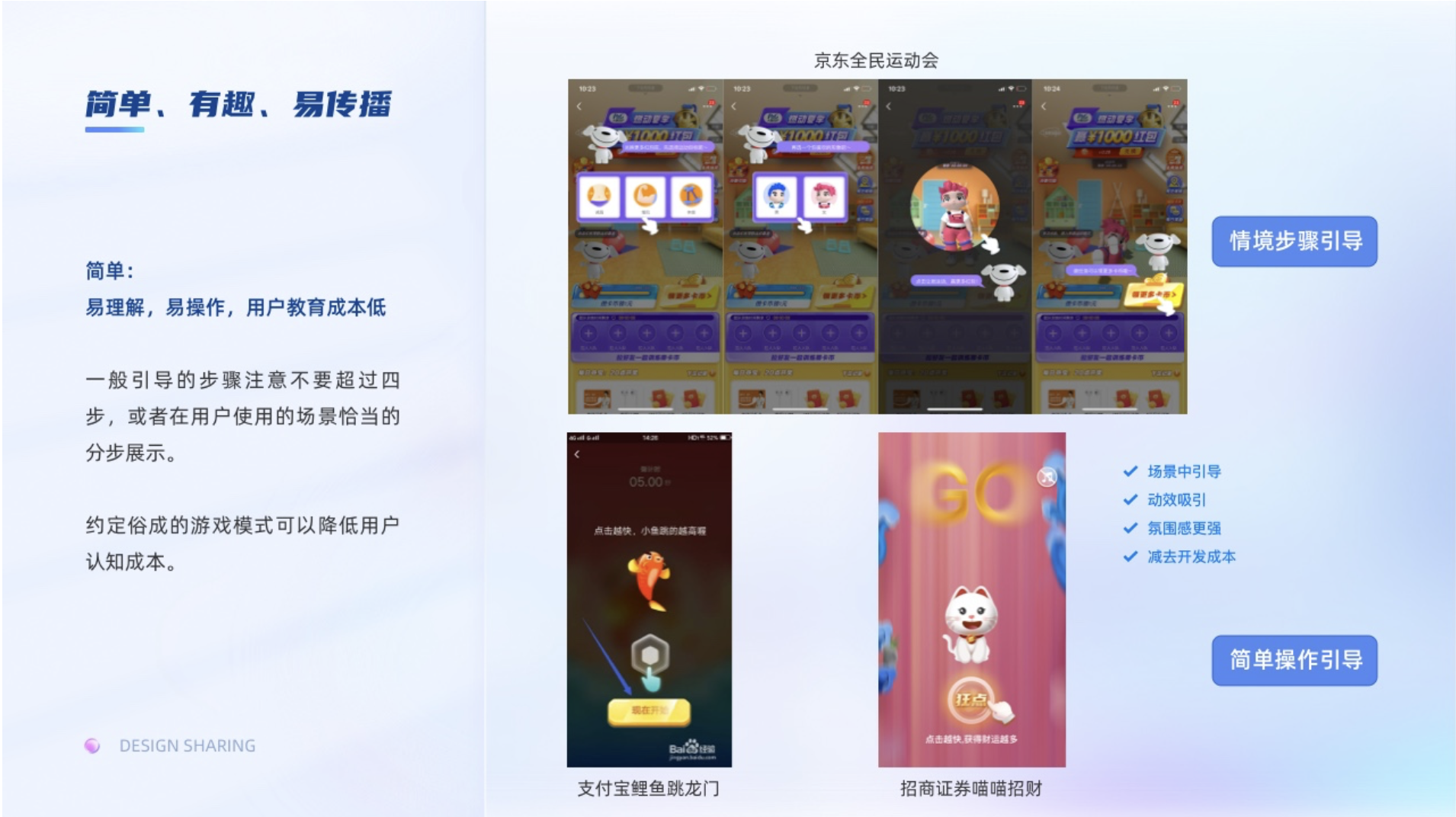 簡單:是指用戶易理解,教育成本低,操作簡單。在運營設計中一般我們會與游戲結合,在此我稱為游戲運營。在游戲運營的設計中,如果不是一個約定俗成用戶都熟悉的游戲任務,教育用戶如何操作的成本是相對較高的,需要有詳細的操作引導。一般引導的步驟注意不要超過四步,或者在用戶使用的場景恰當?shù)姆植秸故?。比如鯉魚跳龍門游戲操作就比較簡單,引導只需要一個簡單的提示;而京東全民運動會作為大型活動比較復雜,引導步驟較多,對一步分用戶來說認知成本高就不會參與活動。