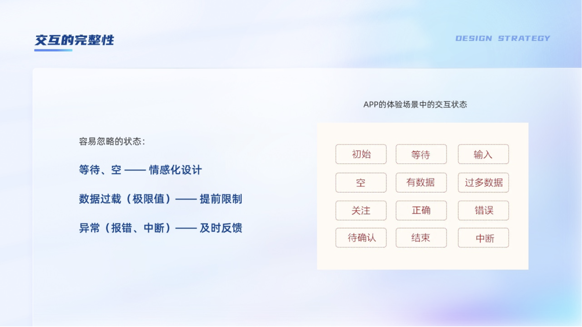 交互狀態(tài)都要考慮全面,如登錄前后狀態(tài),空狀態(tài),各個等級的狀態(tài),任務前后的狀態(tài),不同類別用戶的狀態(tài)等。