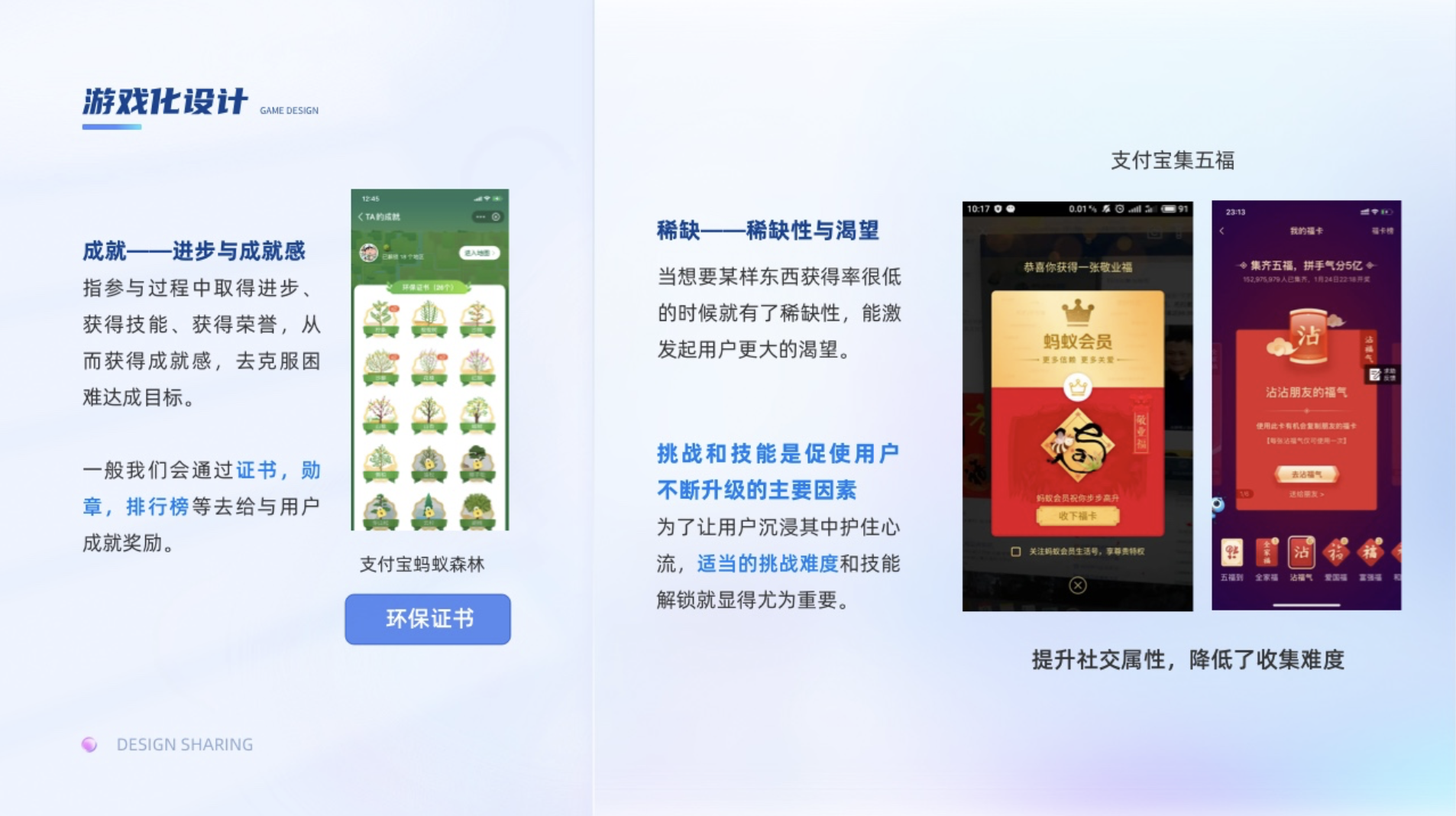 指參與過程中取得進步、獲得技能、獲得榮譽,從而獲得成就感,去克服困難達成目標。一般我們會通過證書,勛章,排行榜等去給與用戶成就獎勵。挑戰(zhàn)和技能是促使用戶不斷升級的主要因素,為了讓用戶沉浸其中護住心流,適當?shù)奶魬?zhàn)難度和技能解鎖就顯得尤為重要。挑戰(zhàn)難度高了容易引起用戶的焦慮,難度低了又會讓用戶感覺無聊。比如集卡行動,在考慮總預算不變的情況下,如何設置稀有卡的比例,集卡的難度就尤為重要。支付寶集五福在初期,敬業(yè)福的比例比較低,所以用戶抽到敬業(yè)福的體驗就很開心,但隨著支付寶后面為了擴大社交屬性,提高了集齊率,集五到五福的興奮感就弱了,導致部分用戶失去動力,因為集到的人越多后續(xù)瓜分的錢就越少。