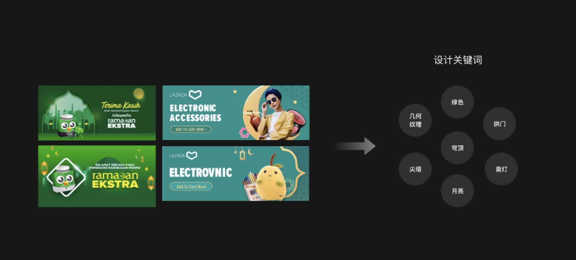 所以在這個(gè)期間做活動(dòng)宣傳時(shí),可以多運(yùn)用伊斯蘭教的一些元素,例如:齋月的齋燈,月亮,以及伊斯蘭教寺廟的尖塔、穹頂和幾何紋理的裝飾等等,都可以融入到設(shè)計(jì)中,形成獨(dú)特的本土風(fēng)格,更容易獲得當(dāng)?shù)厝说南矏酆驼J(rèn)可。