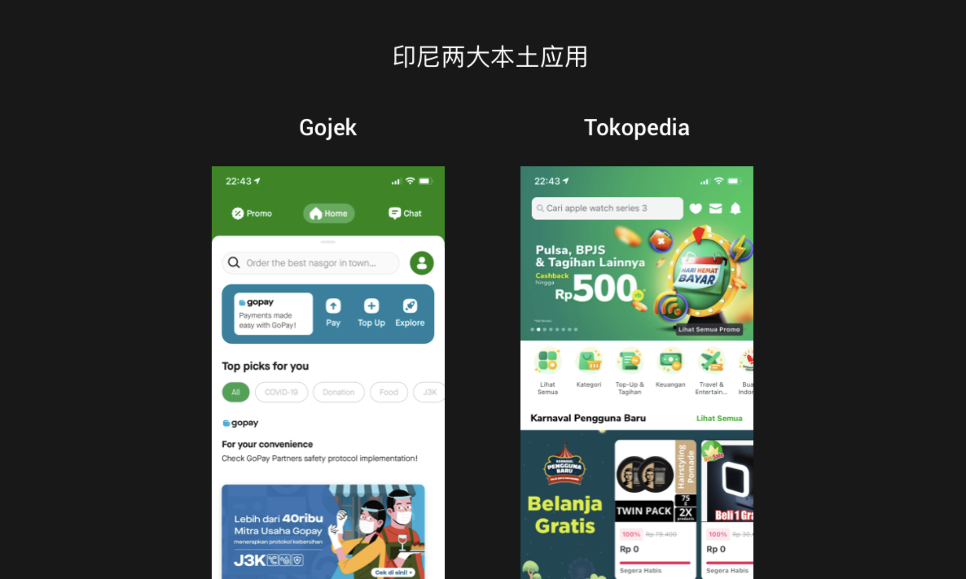 由于是穆斯林國家,綠色深受當(dāng)?shù)厝讼矏?。在伊斯蘭教中,綠色象征著生命與自然。除了綠色,白色和藍(lán)色也是當(dāng)?shù)厝嗣袼矏鄣念伾?。在選擇自己產(chǎn)品的主色調(diào)時(shí),不妨參考這幾種顏色。下圖是印尼的兩大本土應(yīng)用,Gojek 是當(dāng)?shù)氐囊粋€(gè)超級(jí) APP,提供出行、物流、食品、購物、支付等一站式服務(wù),可以理解為是滴滴、美團(tuán)、餓了么、支付寶、順豐等這些公司產(chǎn)品服務(wù)的集合,Tokopedia 是當(dāng)?shù)氐碾娚唐脚_(tái)。兩家都選擇了綠色為主色調(diào),這是因?yàn)閯?chuàng)始人有虔誠的信仰,在伊斯蘭教中,綠色通常被認(rèn)為是伊斯蘭教的象征。