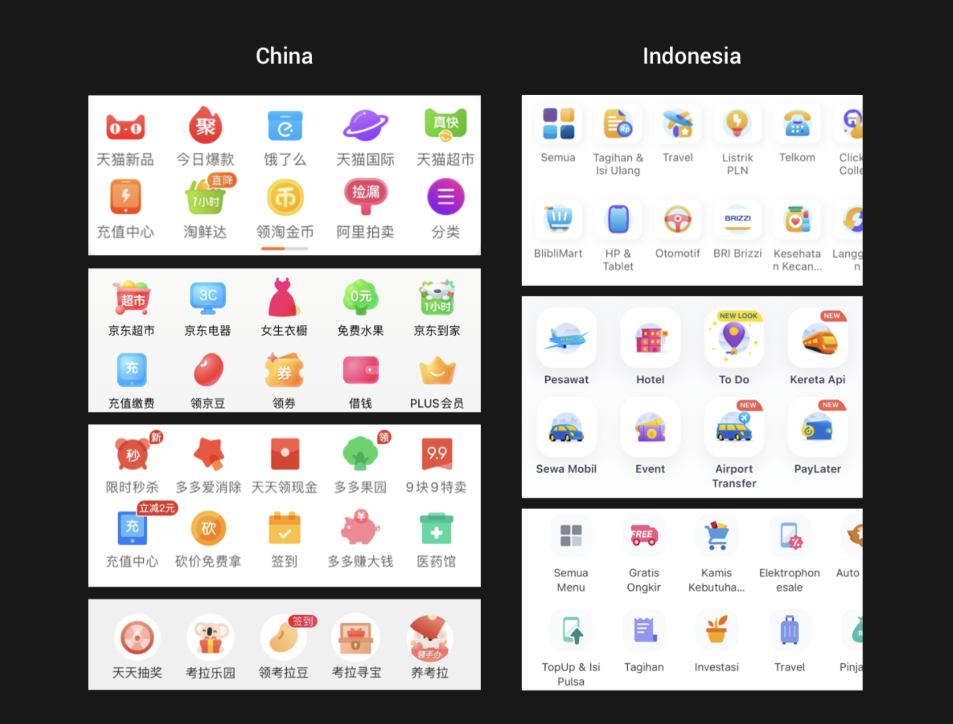 與中國主流的幾家電商平臺(tái)相比,印尼的金剛區(qū)圖標(biāo)在細(xì)節(jié)和色彩的處理上更加豐富。如下圖所示,中國的圖標(biāo)色彩比例大部分是:90%的主色+10%輔色;而印尼的圖標(biāo)色彩比例是:70%的主色+30%的輔色。