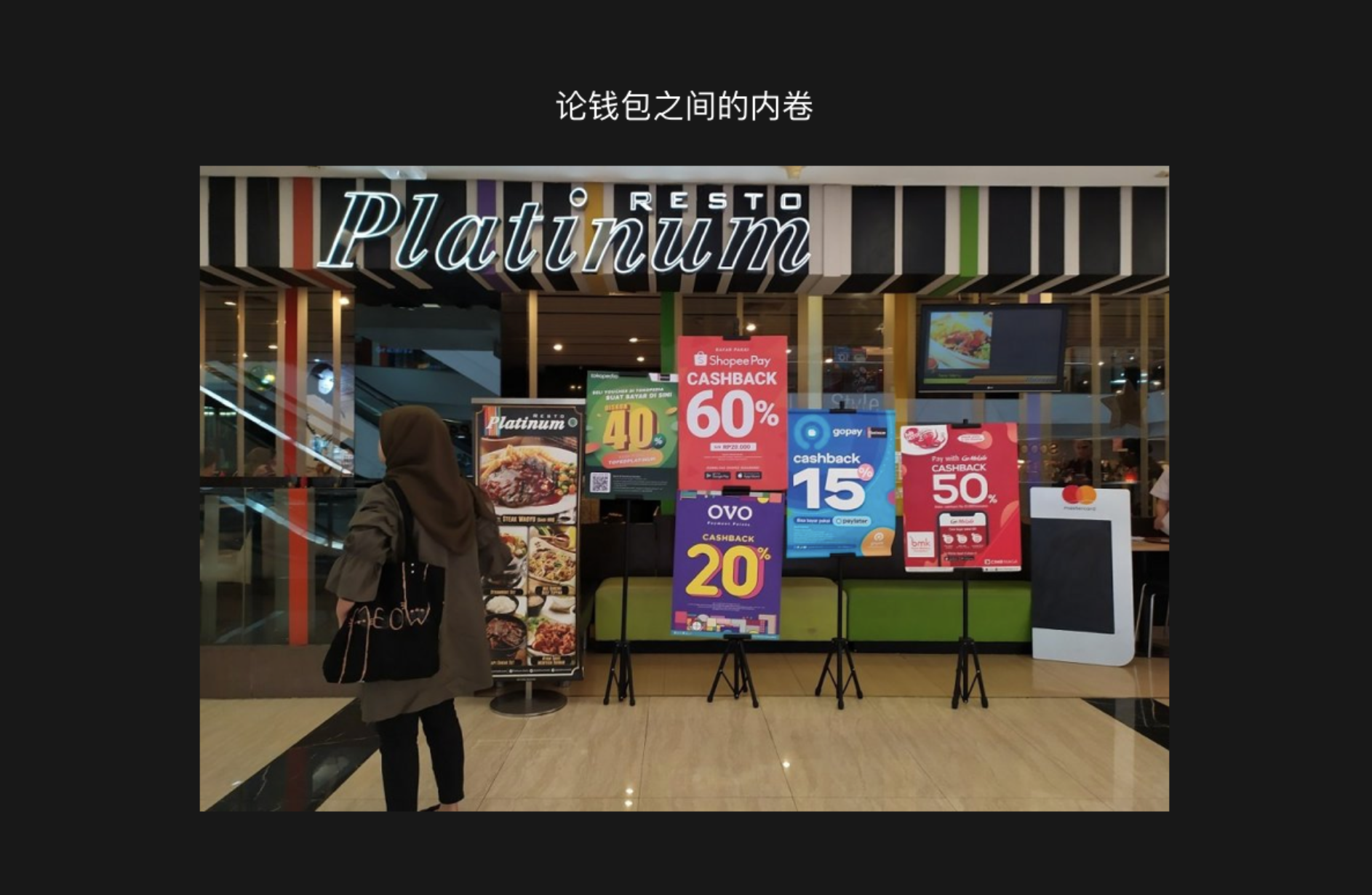 另外,當(dāng)?shù)氐闹Ц斗绞揭卜浅6鄻踊?,在印尼?dāng)?shù)?,可以看到滿大街關(guān)于錢包的 cashback 廣告。目前印尼主流的錢包支付有 GO-pay、OVO、Dana、LinkAja、ShopeePay。