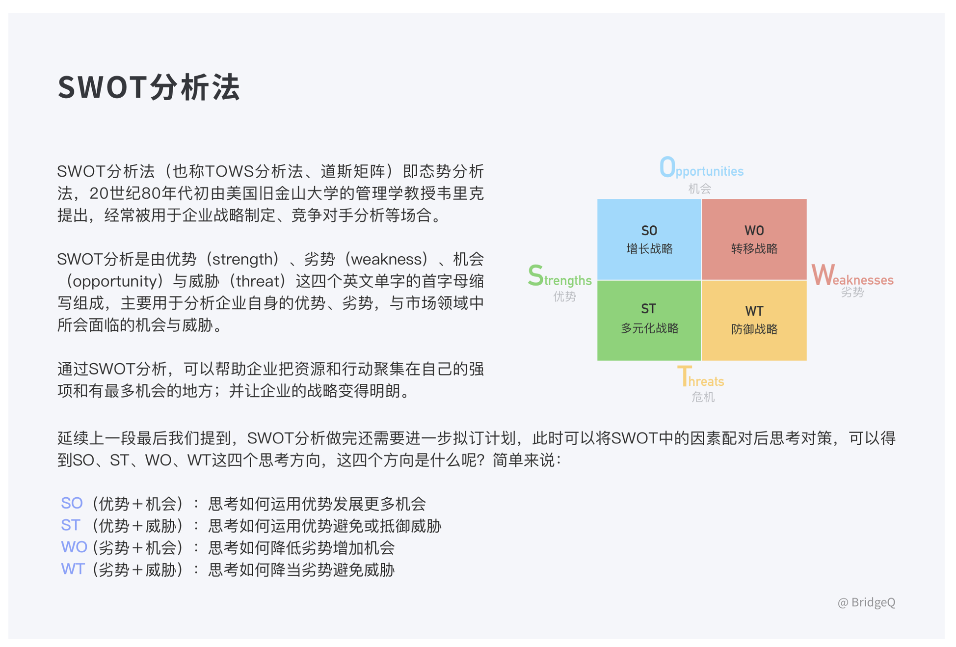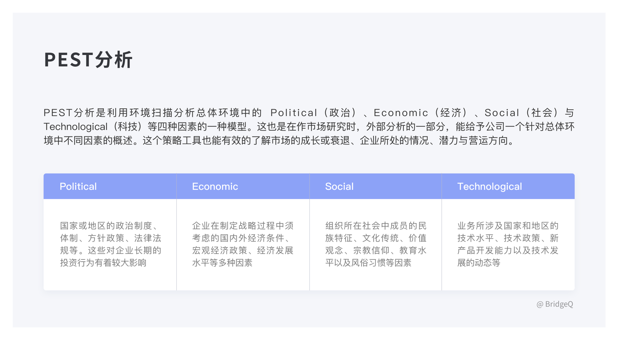 • 方法:PEST(宏觀環(huán)境)、波特五力模型(競(jìng)爭(zhēng)態(tài)勢(shì))、SWOT 分析(優(yōu)劣勢(shì))。