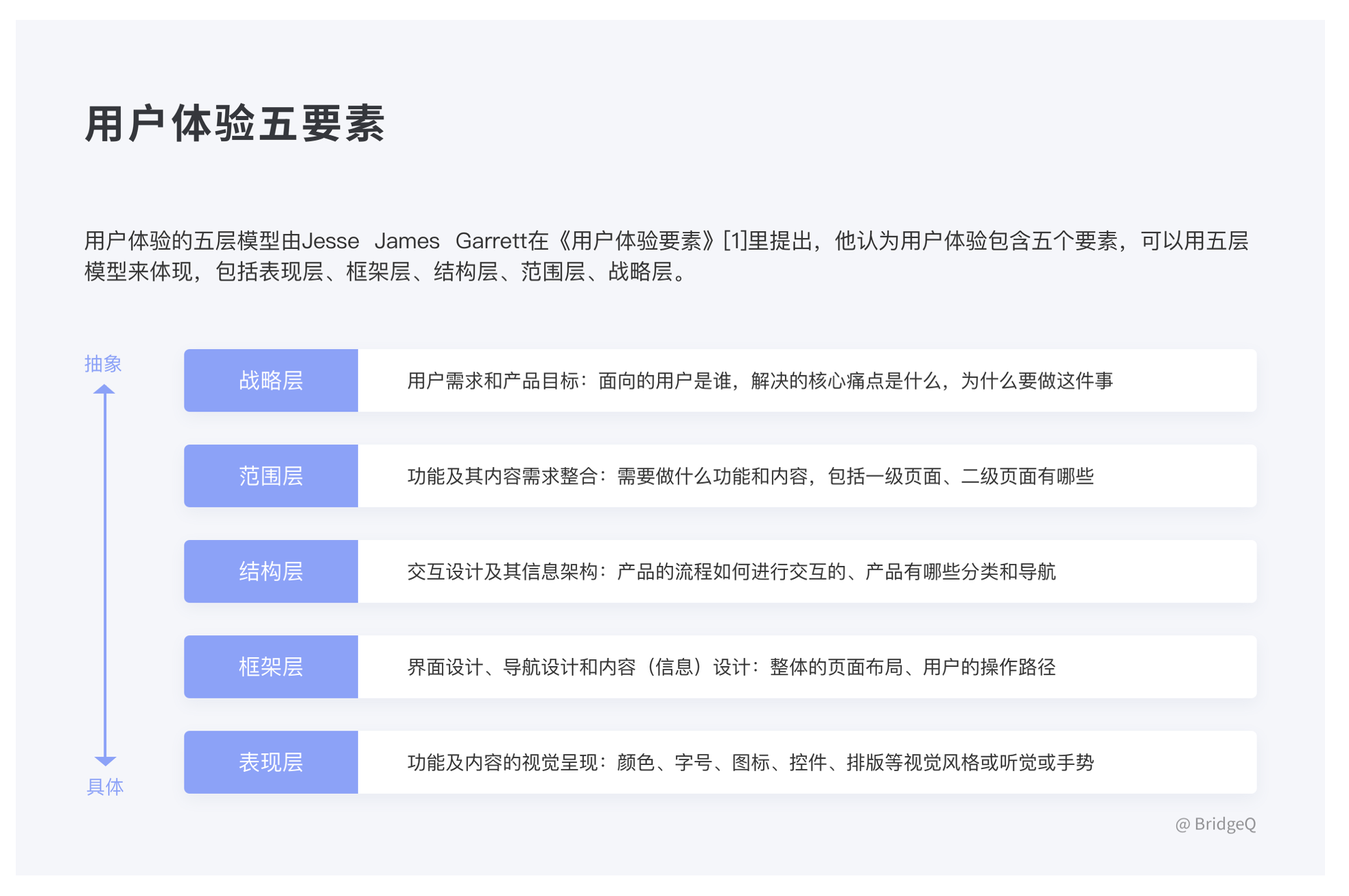 • 核心方法:用戶體驗(yàn)五要素(戰(zhàn)略層、范圍層、結(jié)構(gòu)層、框架層、表現(xiàn)層)。