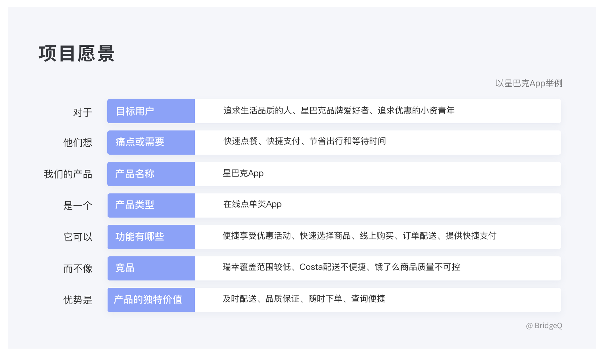• 核心內(nèi)容:目標(biāo)用戶、痛點(diǎn)、產(chǎn)品定位、功能價(jià)值、競(jìng)品差異、獨(dú)特優(yōu)勢(shì),需簡(jiǎn)潔且突出重點(diǎn)。