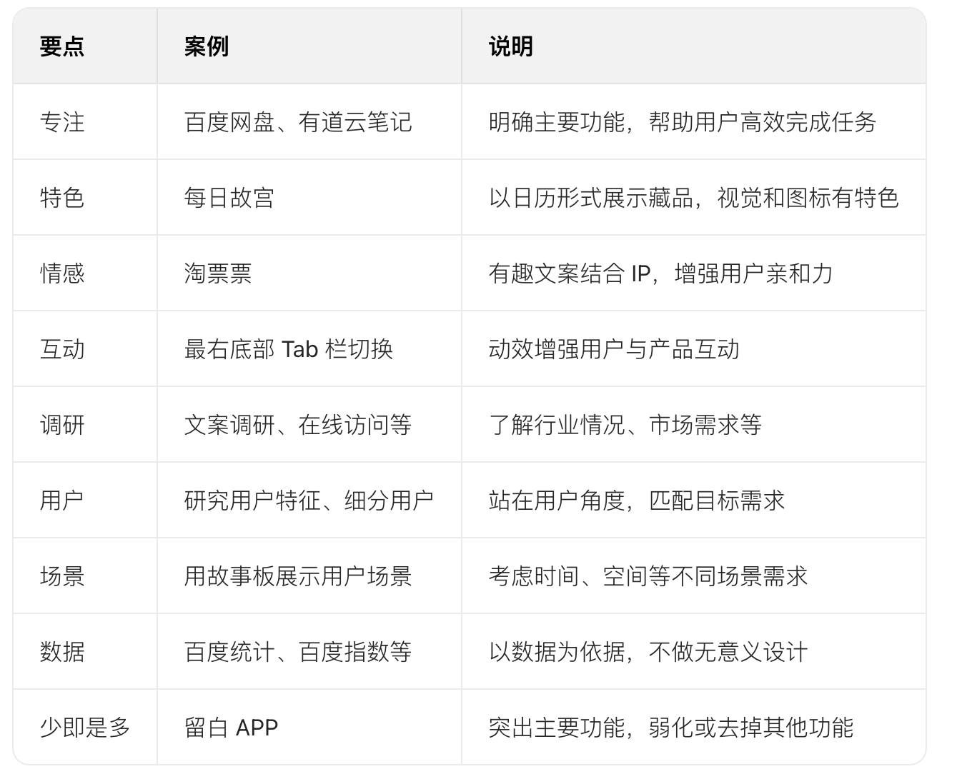 - 答案:設(shè)計前的案例分析包含專注(明確主要功能)、特色(區(qū)別于同行的功能、體驗或視覺)、情感(加入情感化設(shè)計)、互動(運用動效)、調(diào)研(了解行業(yè)和市場)、用戶(研究用戶特征和需求)、場景(考慮用戶使用場景)、數(shù)據(jù)(以數(shù)據(jù)為設(shè)計依據(jù))、少即是多(突出主要功能)這 9 個關(guān)鍵要點。